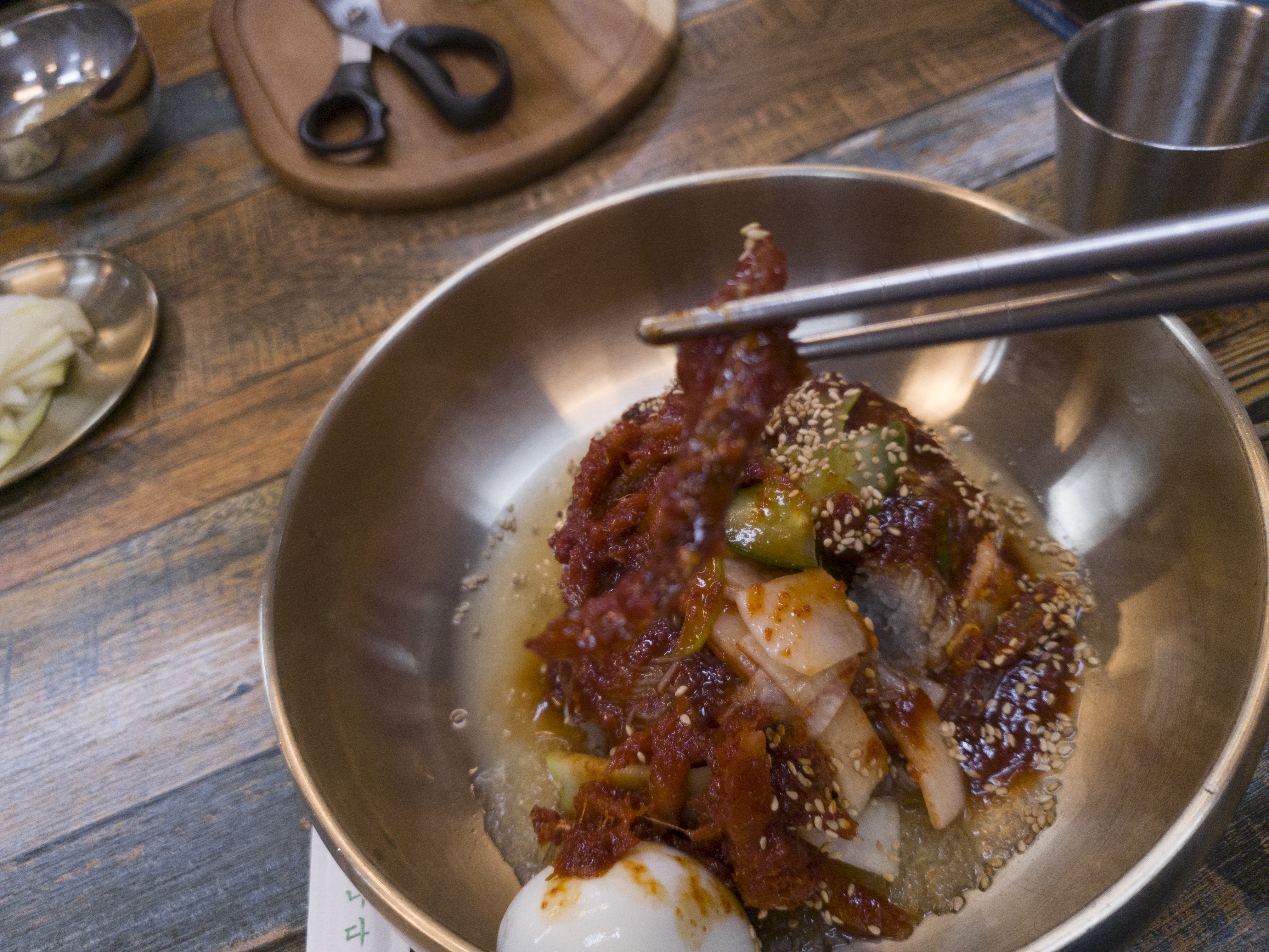 사람마다 취향이라는 것이 어느 정도 있어서 냉면에 식초와 겨자를 넣어서 먹는 사람들이 많이 있을 것이다. 하지만 나는 그렇게 먹기보다는 코다리와 냉면의 그 고소한 식감과 살짝 매콤함을 더 좋아하는 편이어서 아무것도 넣지 않고 먹는다. 선호하는 식감에 따라서 다르긴 하겠지만 웬만하면 소스를 많이 먹는 것을 좋아하지 않는다. 본연의 재료가 맛있으면 그냥 먹어도 맛있기 때문이다.