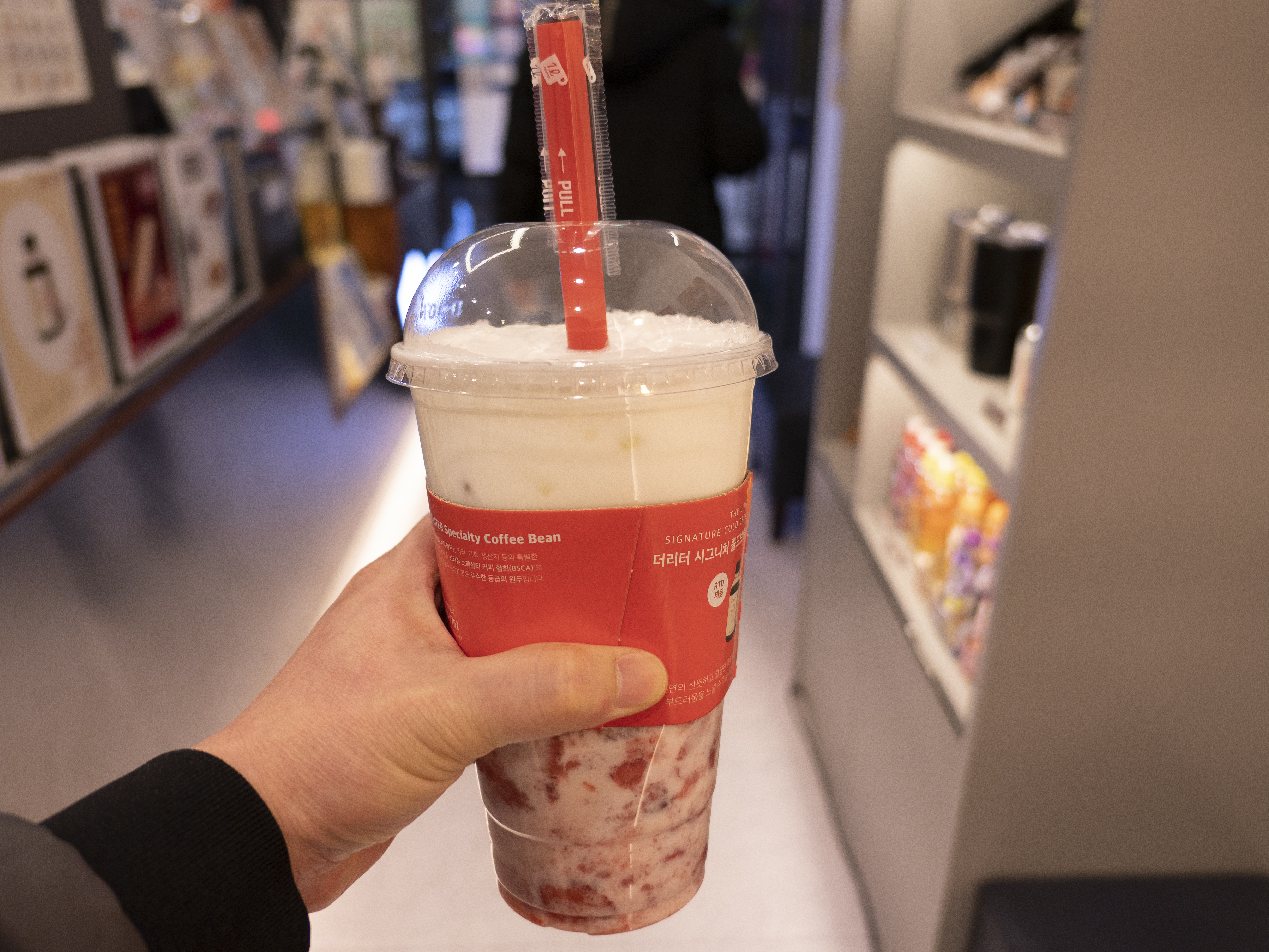 저는 처음 방문을 한 날에는 딸기 쏙 쏙을 주문을 했습니다. 커피를 마실까 고민을 하기도 했지만 이 날은 커피를 많이 마셔서 다른 것을 먹어볼까 했다가 메뉴 보고 고르다가 결정을 하게 되었어요. 익숙한 맛이었어요. 딸기가 많이 들어있고 얼음도 팍팍 들어있고 살짝 달달한 편이어서 후식으로 생각을 하고 있어서 먹기에도 잘 들어가더라고요. 용량이 커서 그런지 우유도 많이 들어간 것 같아요.