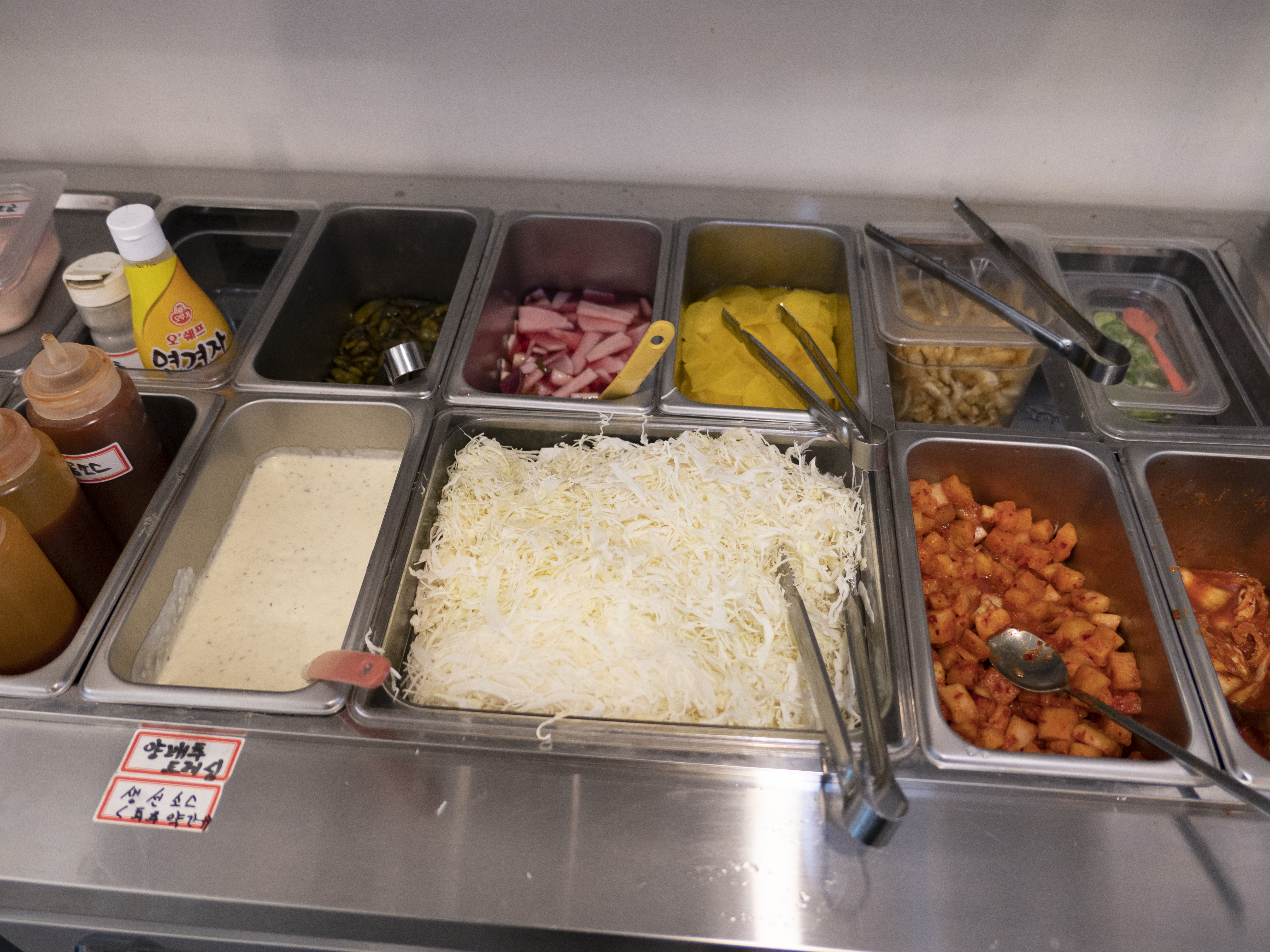 반찬의 경우에는 특별한 것은 없고 그냥 기본적으로 가지고 있어야 하는 것이 대부분이었어요. 근데 제가 여기서 좋다고 생각을 한 것이 양배추만 먹는 것을 저는 좋아하는 편이거든요. 드레싱도 셀프로 해야 하기 때문에 좋아하는 양배추를 마음껏 먹을 수 있어서 좋았습니다. 나머지 깍두기와 김치는 소소한 편이었어요 제일 많이 먹게 된 것은 양배추이고 그리고 의외로 저는 보쌈 같은 느낌이라고 해야 할까요 김치랑 같이 먹어도 맛깔나게 먹을 수 있어서 괜찮다고 생각을 했습니다. 저는 의외로 이런 입맛이 더 좋게 느껴지네요.