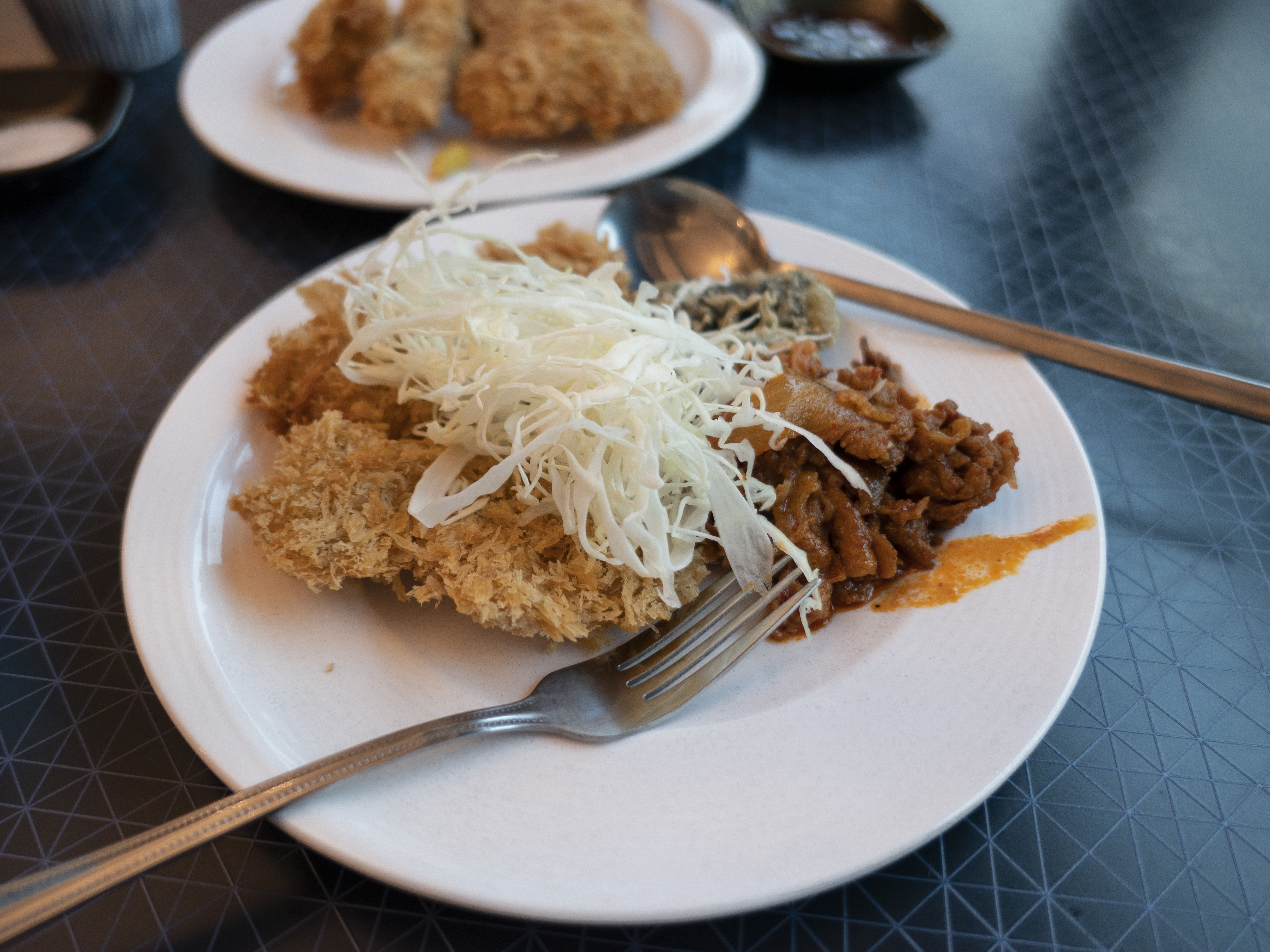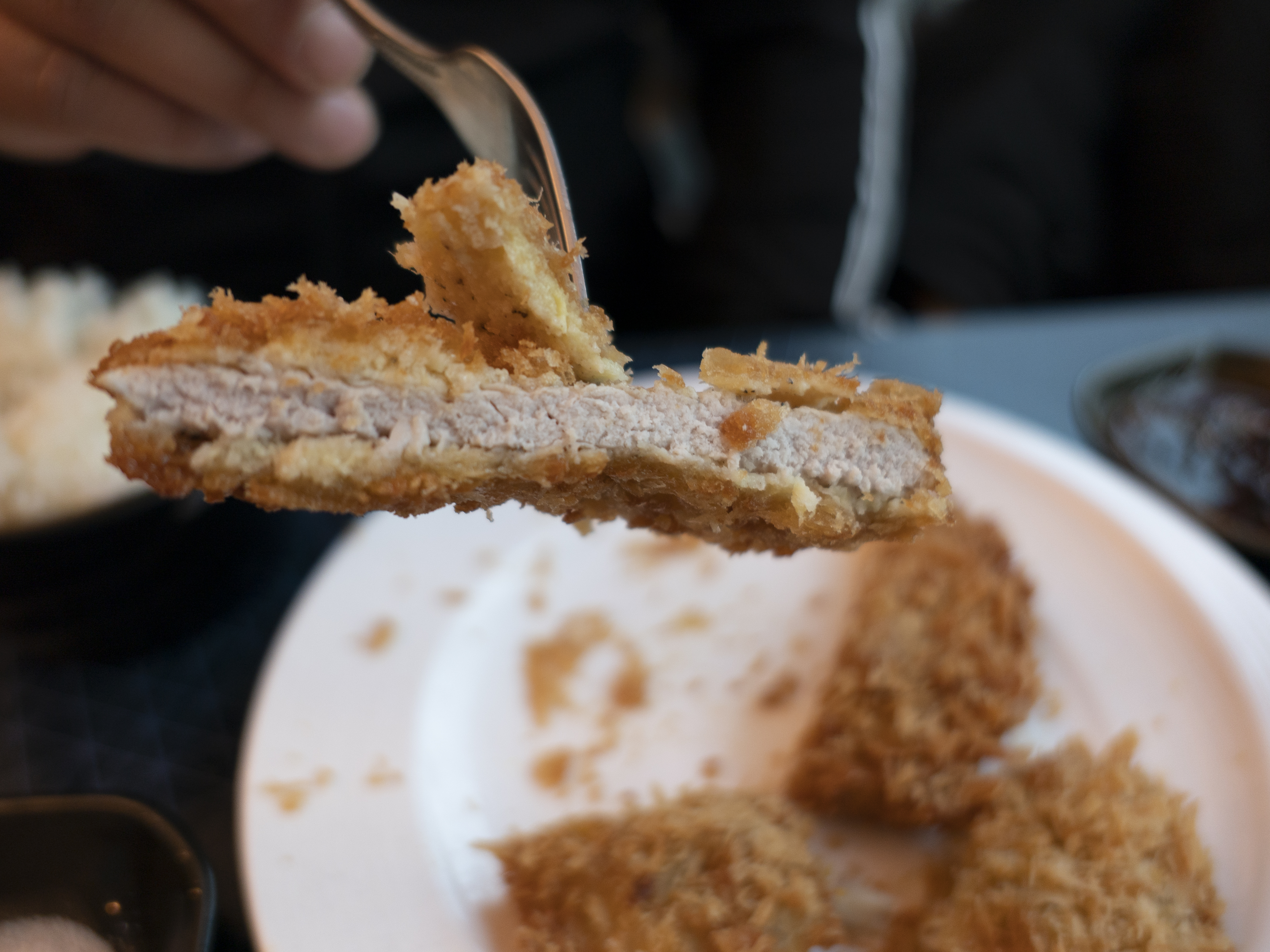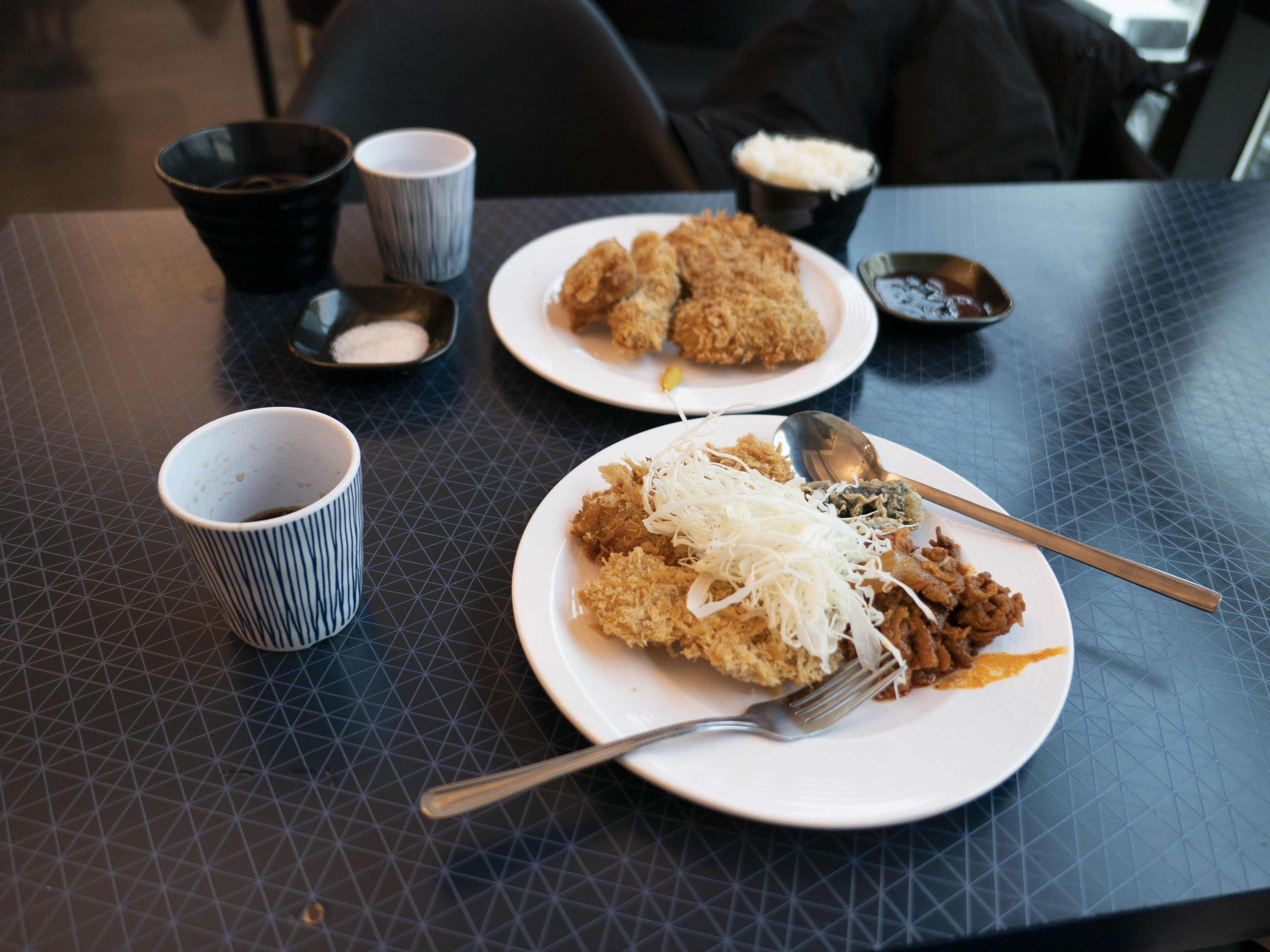 돈가스가 쌓여있는데요 카메라 조리개를 잘 설정을 못해서 이상하게 나오기는 했지만 모자라지 않게 계속해서 잘 튀겨서 나오는 모습이 인상적이었습니다. 돈가스의 종류는 등심, 안심, 치킨, 생선 이렇게 4가지가 있었는데 개인적으로는 등심이 조금 더 괜찮다는 생각이 들었고 친구의 경우에는 생선이 더 괜찮았다고 하니 어느 정도 취향의 차이는 있을 수 있기는 하겠지만 적당하게 괜찮은 편이었습니다.