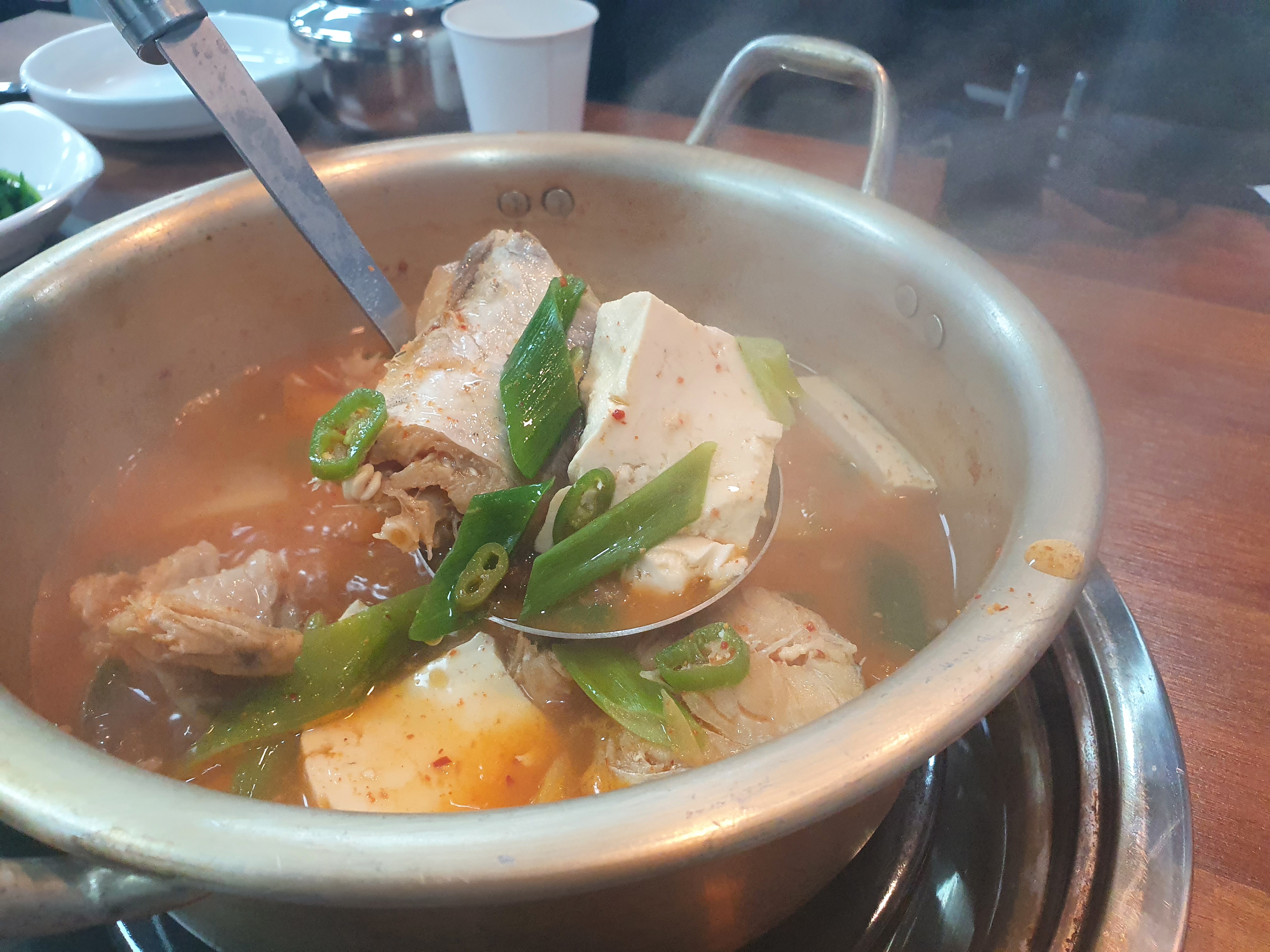 드디어 나온 동태탕입니다. 매번 다 들어오시면 일일이 손질하고 하신다고 하시네요. 동태탕은 이렇게 나오는데 조금 어두워지고 선선해지면 그 때 딱 먹기 좋은 그런 동태탕 메뉴입니다. 한번 주방에서 끓여서 나오시고 살짝 만 더 끓이면 될 수 있도록 해서 나옵니다.