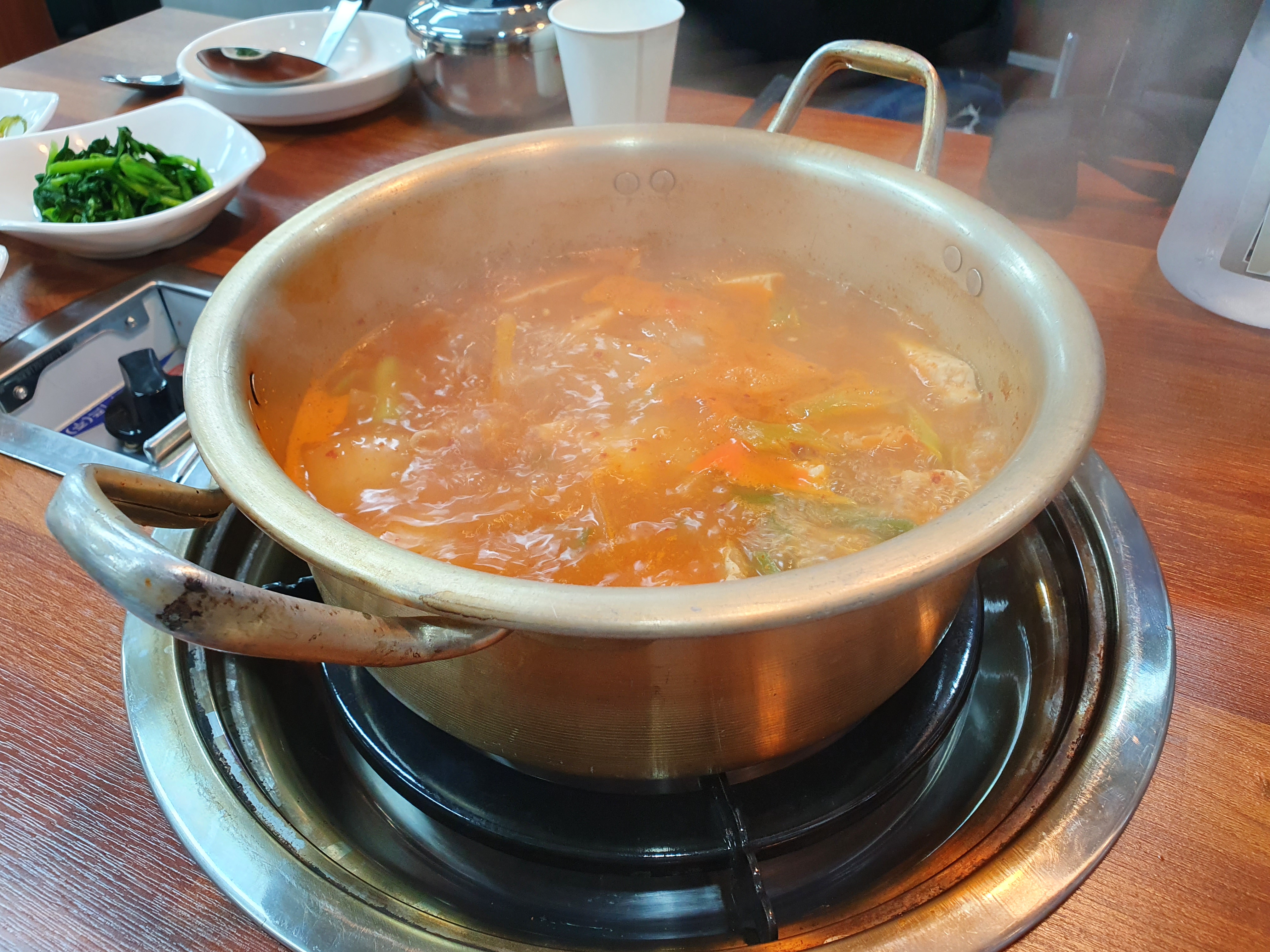 2인분의 양인데 양푼으로 크게 해서 나옵니다. 1인분에는 6천원인데 그럴 땐 뚝배기로 담겨서 나온다고 하네요. 항상 2인으로 먹기 때문에 대부분 양푼으로 해서 끓여 먹게 되고는 합니다. 새벽부터 문을 여서서 밤까지 하시고 주위에 일하시는 분들로 문전성시를 이루는 그런 곳이기도 합니다.