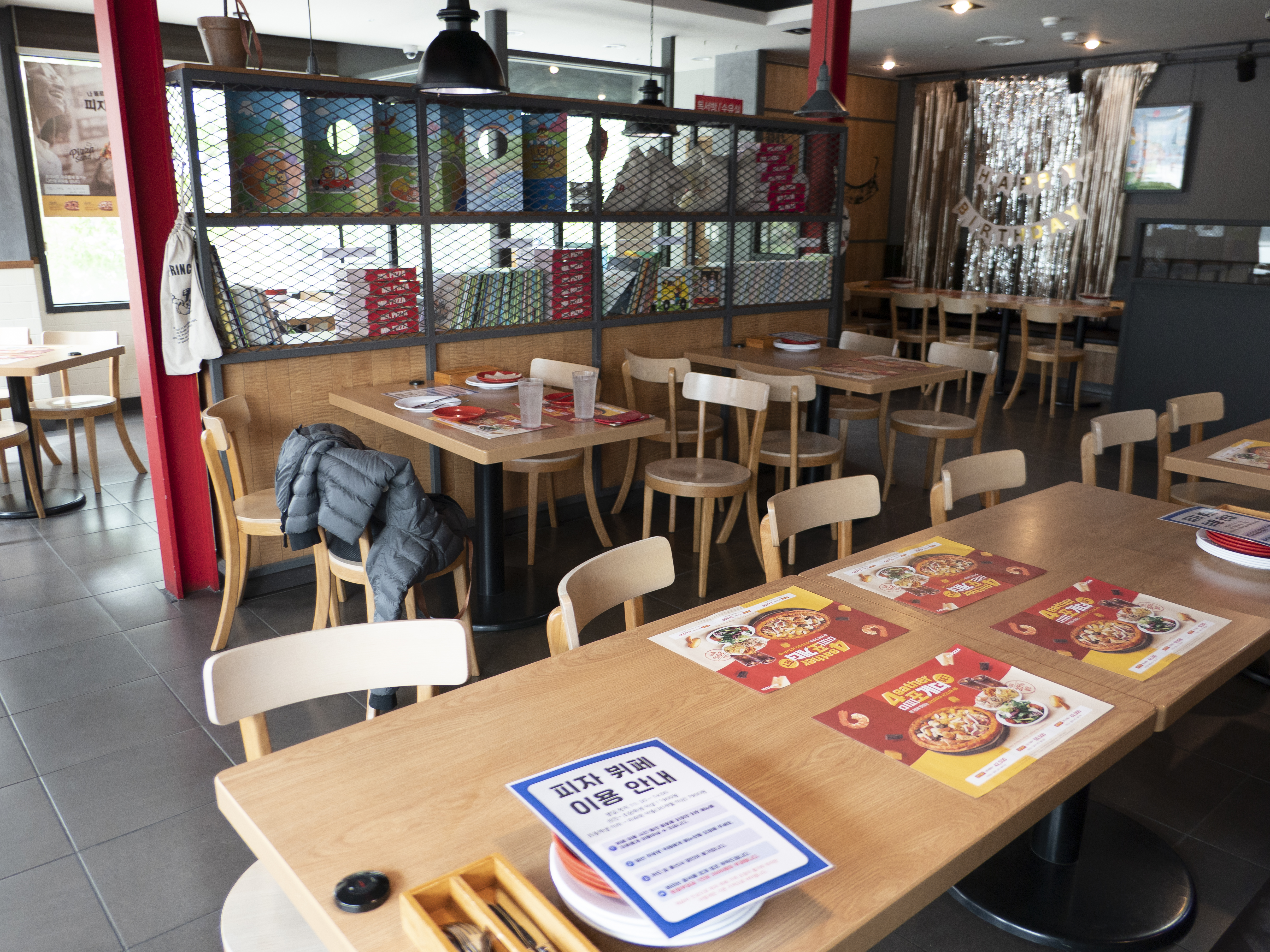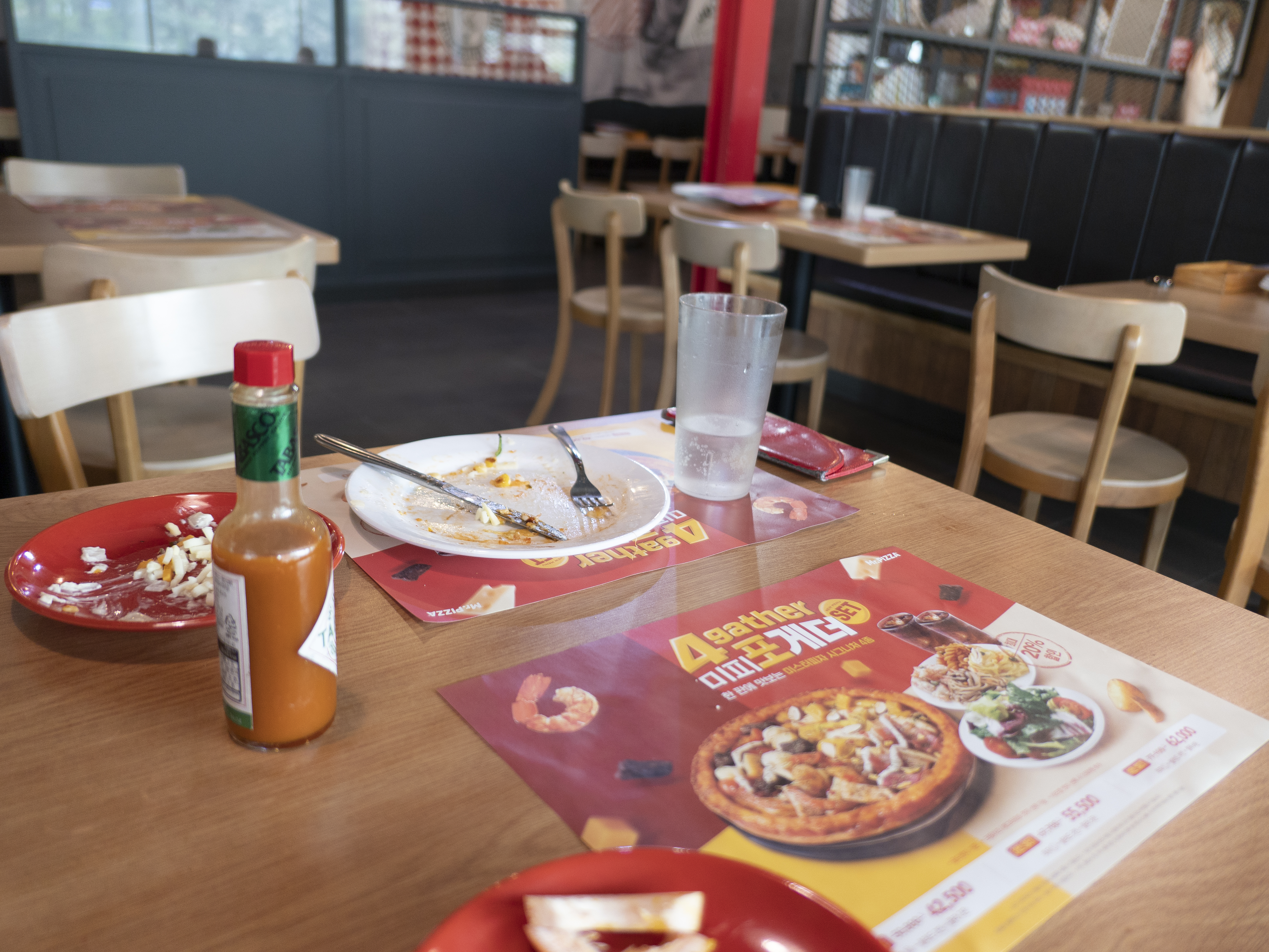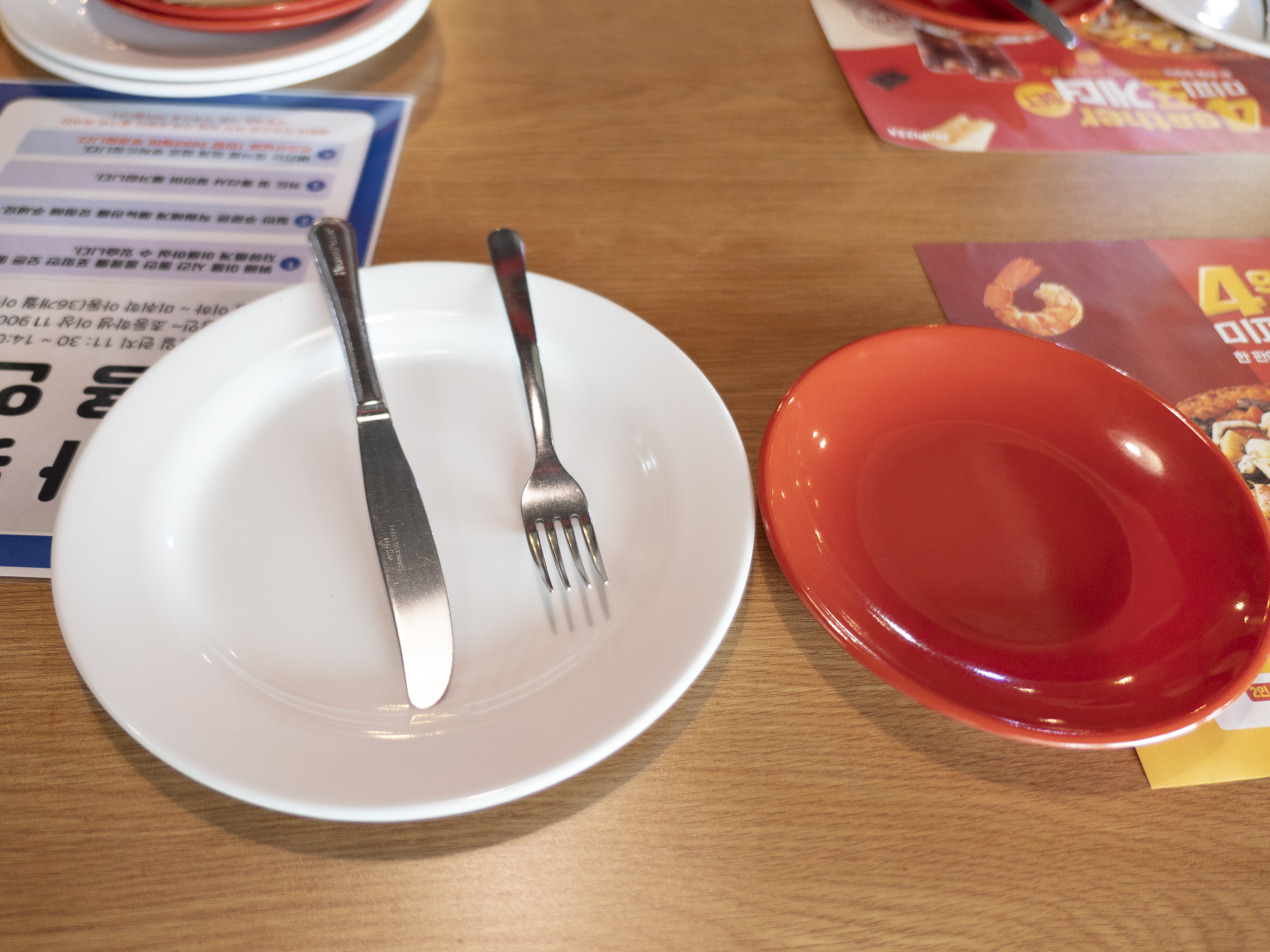 흰 접시에는 피자를 담고 빨간 접시에는 샐러드를 담을 수 있게 간단한 구성으로 되어있습니다. 피자를 먹기 시작을 보통 콜라를 많이 드시잖아요. 여기는 콜라도 리필이 되는 것이 신기했습니다. 한 가지 신기한 것은 그냥 기계가 있어서 셀프로 담는 것이 아니라 직원에게 요청을 해야 하네요. 왜 그런지는 모르겠지만 리필이 되기 때문에 저는 사이다 콜라 한 번씩 해서 마시고는 했습니다. 자리에 앉으면 대충 이렇게 이용을 하시면 된다고 간단하게 설명을 듣기는 했는데 특별한 것은 없었던 것 같아요.