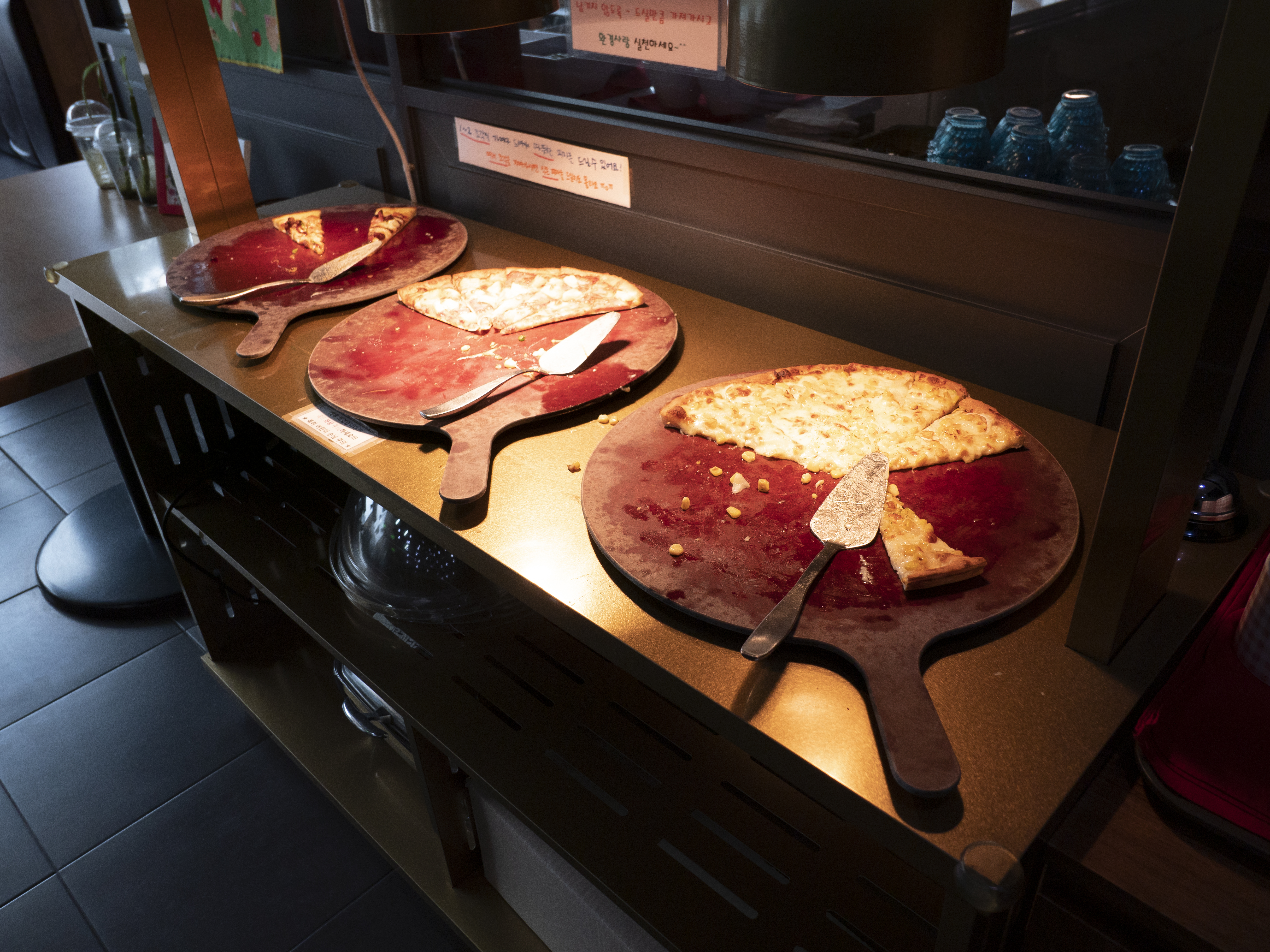 피자가 새로 나오게 되면 종을 한번 치시네요. 그렇게 다양한 피자를 먹을 수 있다는 것은 엄청난 장점이라고 생각을 하고 있어요. 제가 먹게 되면서 느낀 점은 점심시간 딱 12시가 되면은 사람들이 많이 몰려서 계속 먹기 때문에 피자가 나오는 회전율이 굉장히 높은 편이였어요. 하지만 1시가 지나가는 시점이 되니 들어오시는 분들도 줄어들고 드시는 양도 줄어들어서 인지 회전률이 조금씩 떨어지네요. 당연한 이야기일 수도 있겠지만 많이 다양한 피자를 드시고 싶으신 분들이라면 12시 부근에는 자리를 잡고 앉아서 먹어야 되지 않을까 싶습니다. 물론 서울이나 사람이 많은 곳에서라면 이런 걱정을 안 하셔도 될지는 모르겠지만 제가 있는 의정부에는 그런 상황이네요.