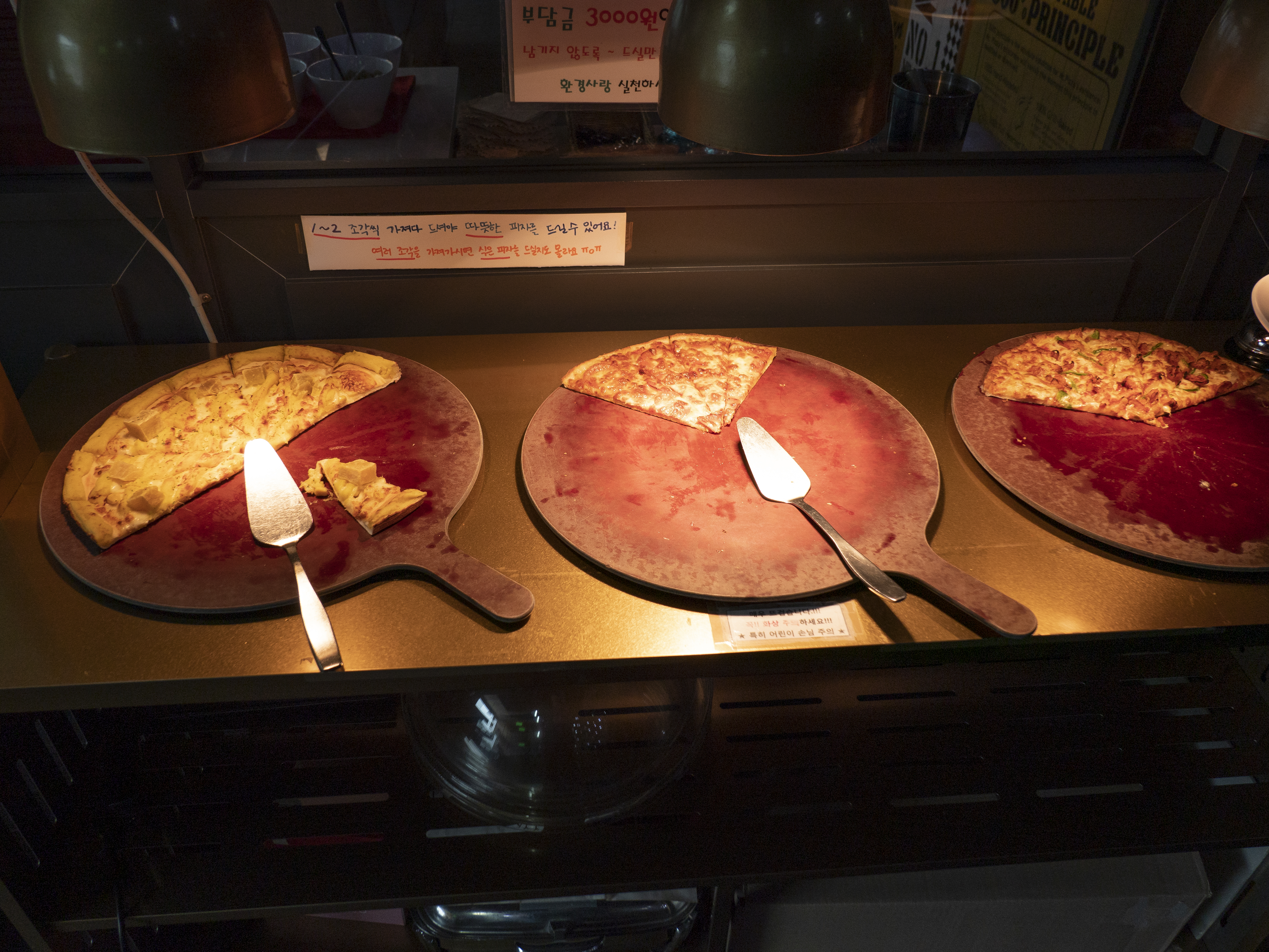 제가 간 미스터피자는 3판이 있렇게 종류별로 있었고 하나씩 떨어지면 다시 채워 넣고 하는 식이였어요. 한 번에 3가지씩은 맛을 볼 수 있다는 것이 너무나 큰 장점이라고 생각을 했습니다. 그리고 좀 있다가 또 채워지고 해서 저는 총 8가지 종류 피자를 먹을 수 있었습니다.