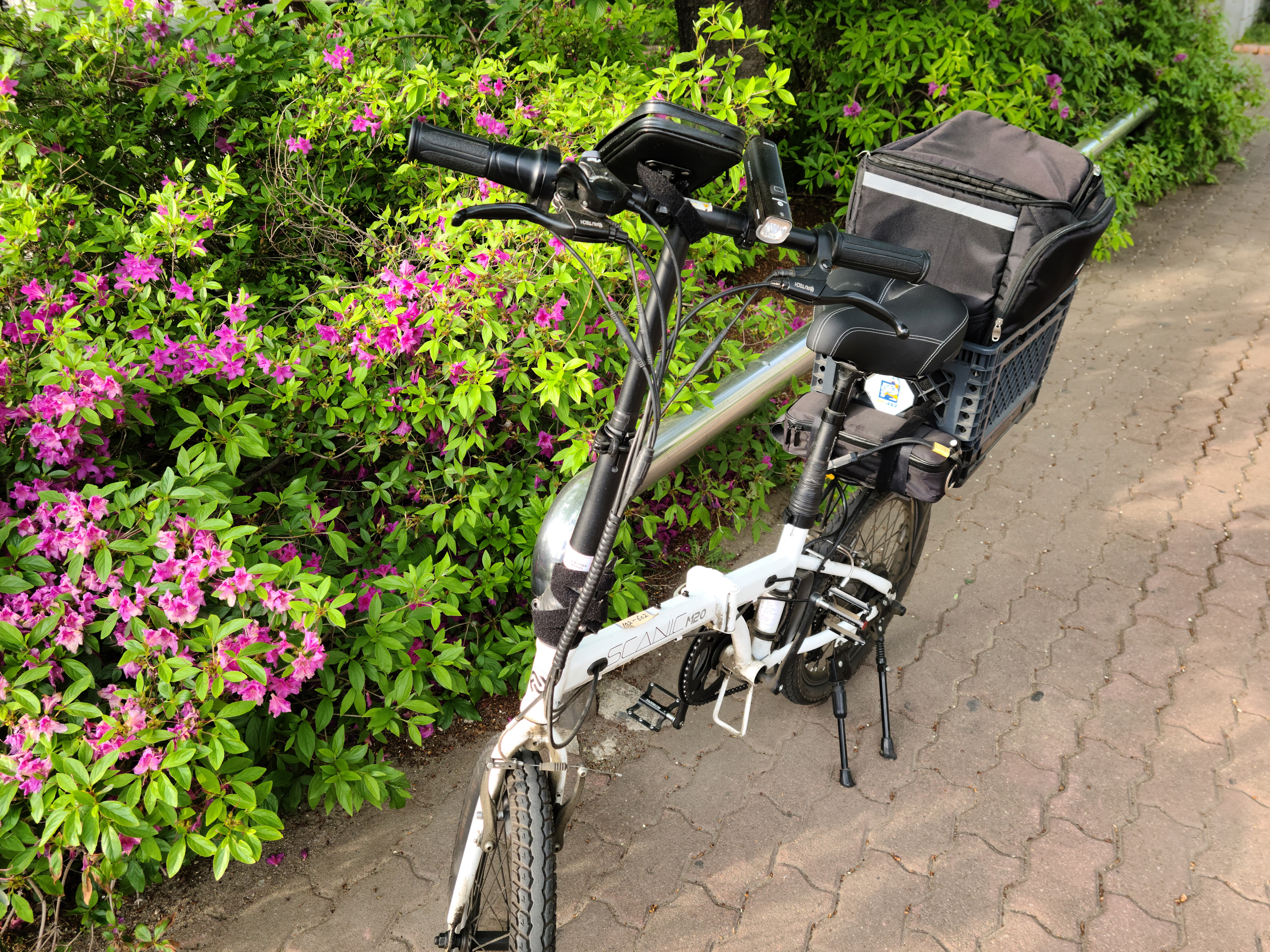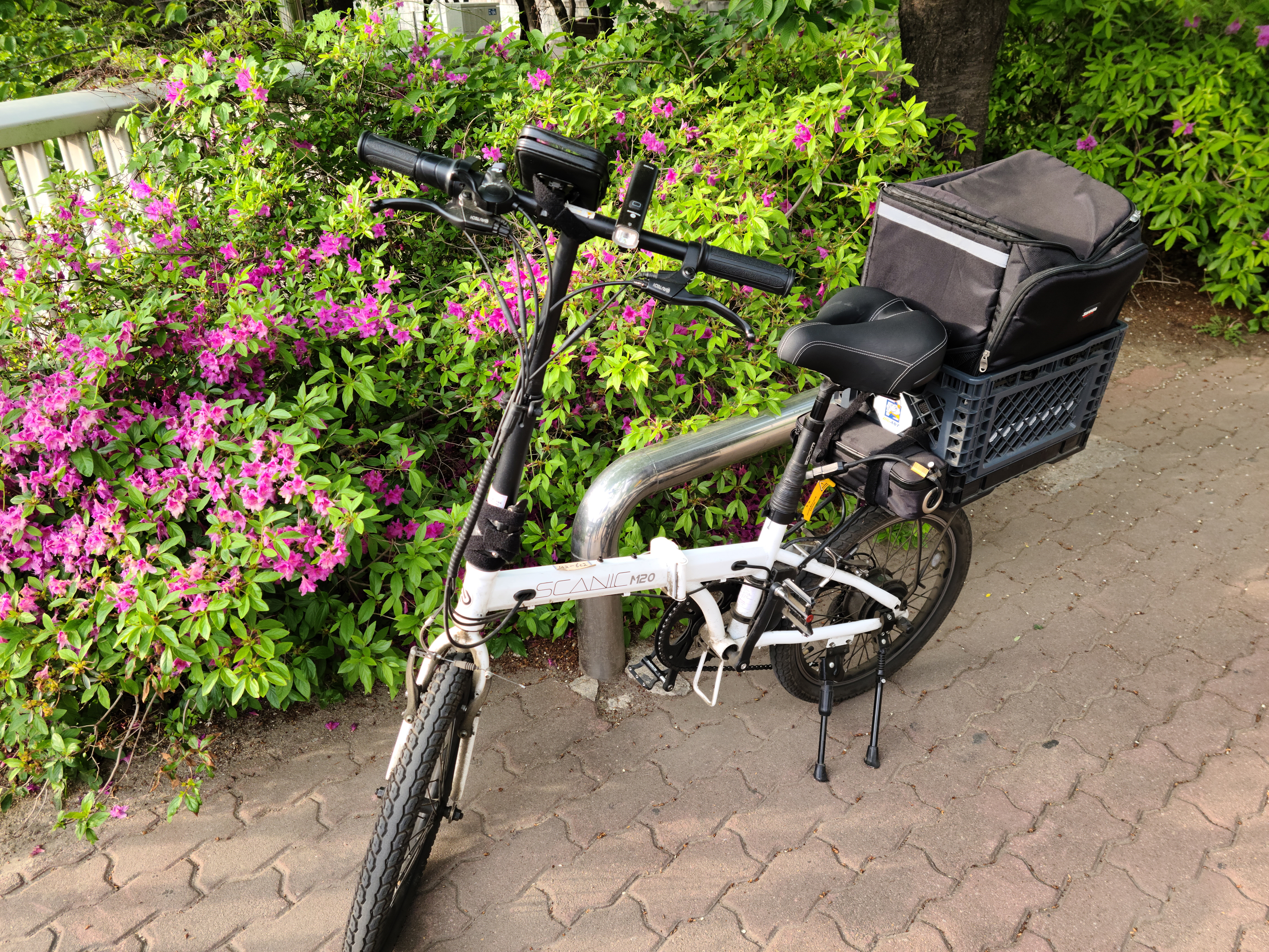 전기자전거의 특성인지는 모르겠지만 나 같은 경우에는 모든 무게가 뒷바퀴에 중점을 두고 있다. 뒷바퀴에는 박스, 배터리, 가방, 모터 등등 뒷바퀴를 중심으로 무게 중심이 이루어지다 보니까 조금 무게를 분산을 시켜주어야 하지 않을까 하는 걱정과 고민도 조금은 하고 있었다. 그래서 한 번은 배터리를 앞바퀴 쪽으로 이동을 해서 달아보았는데 조금 더 안정적으로 느낄 수 있기는 했지만 문제는 자전거에서 내려올 때마다 다리에 걸리적거리는 것이 싫었다. 그래서 다시 뒷자리도 배터리를 자리를 옮기게 되었다. 다리가 긴 사람은 문제가 없기는 하겠지만 짧다면 고민을 좀 해봐야 할 것 같다.