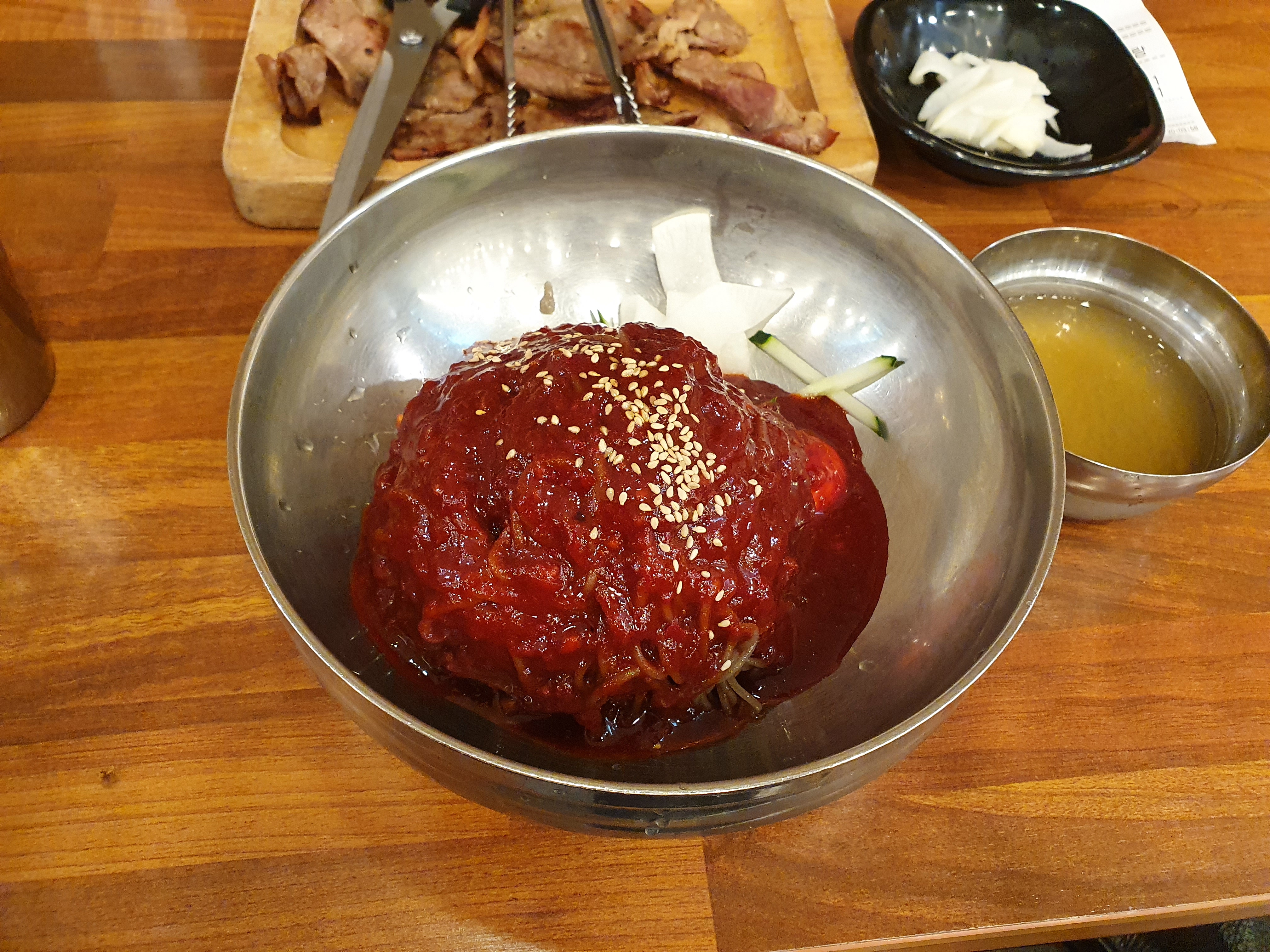 시원하게 비벼서 먹으면 맛있는 것 같아요. 냉면집 답게 숯불고기를 제외하면 그냥 별다른 반찬이나 이런것들은 없습니다. 잘 비벼서 먹기만 하는 느낌이에요. 양념은 무난하게 맛있는 여러분들이 흔하게 비빔냉면 먹었다면 생각하는 그 맛을 잘 따르고 있는 집입니다. 육수도 같이 주는데 양 조절을 잘 해야 합니다. 다 넣으면 싱거울 수도 있어요.