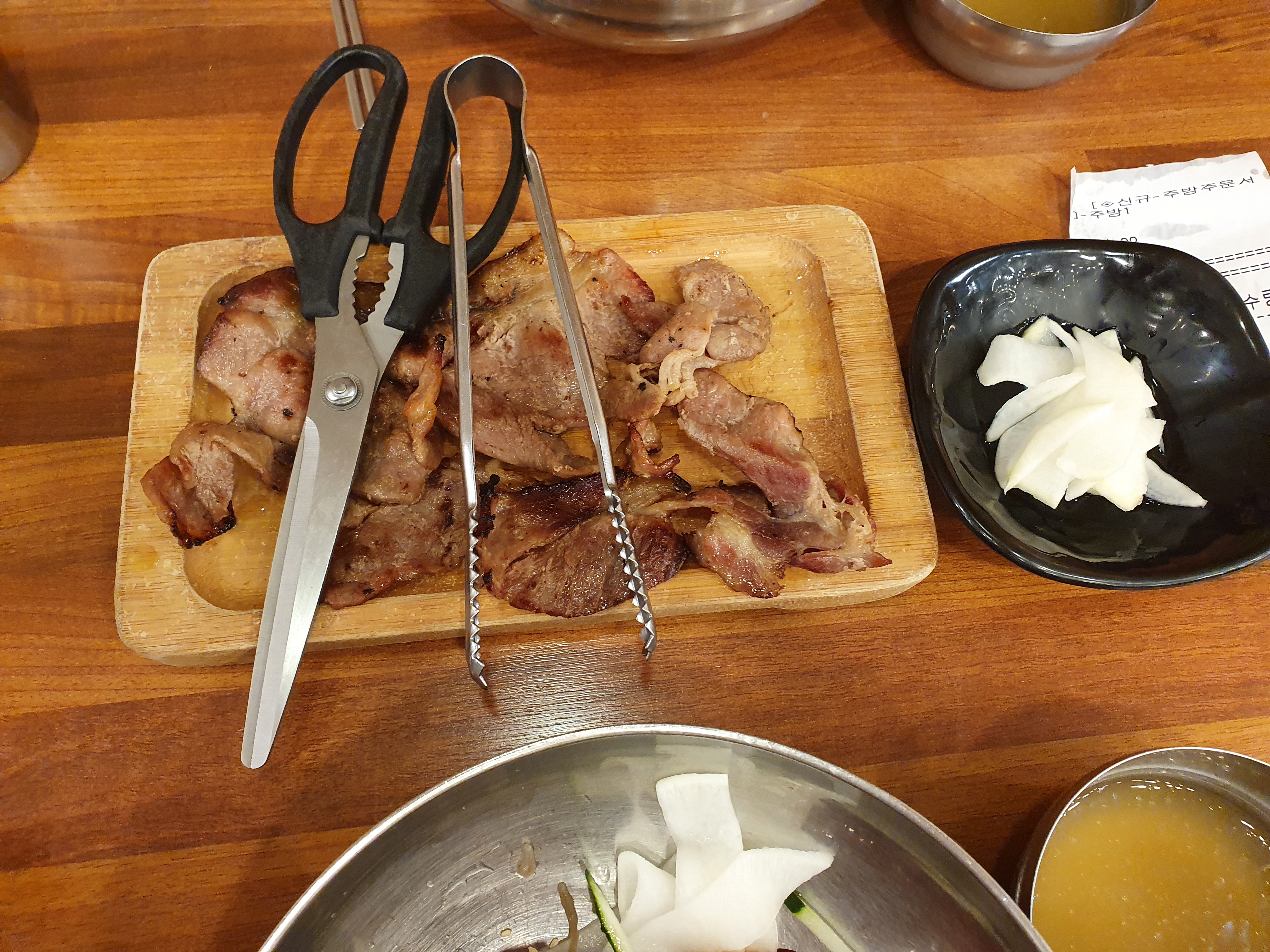 그리고 얇은 숯불고기가 함께 나옵니다. 종이처럼 얇지만 잘 구워져서 나오는 편이라서 입맛을 돋구는데는 딱 괜찮은 수준이라고 생각을 해요. 고기에 냉면은 뭐 맛이 없을 수가 없는 조합이잖아요. 물론 두개를 시켜서 저정도의 양이고 하나를 시키면 더 줄어듭니다.