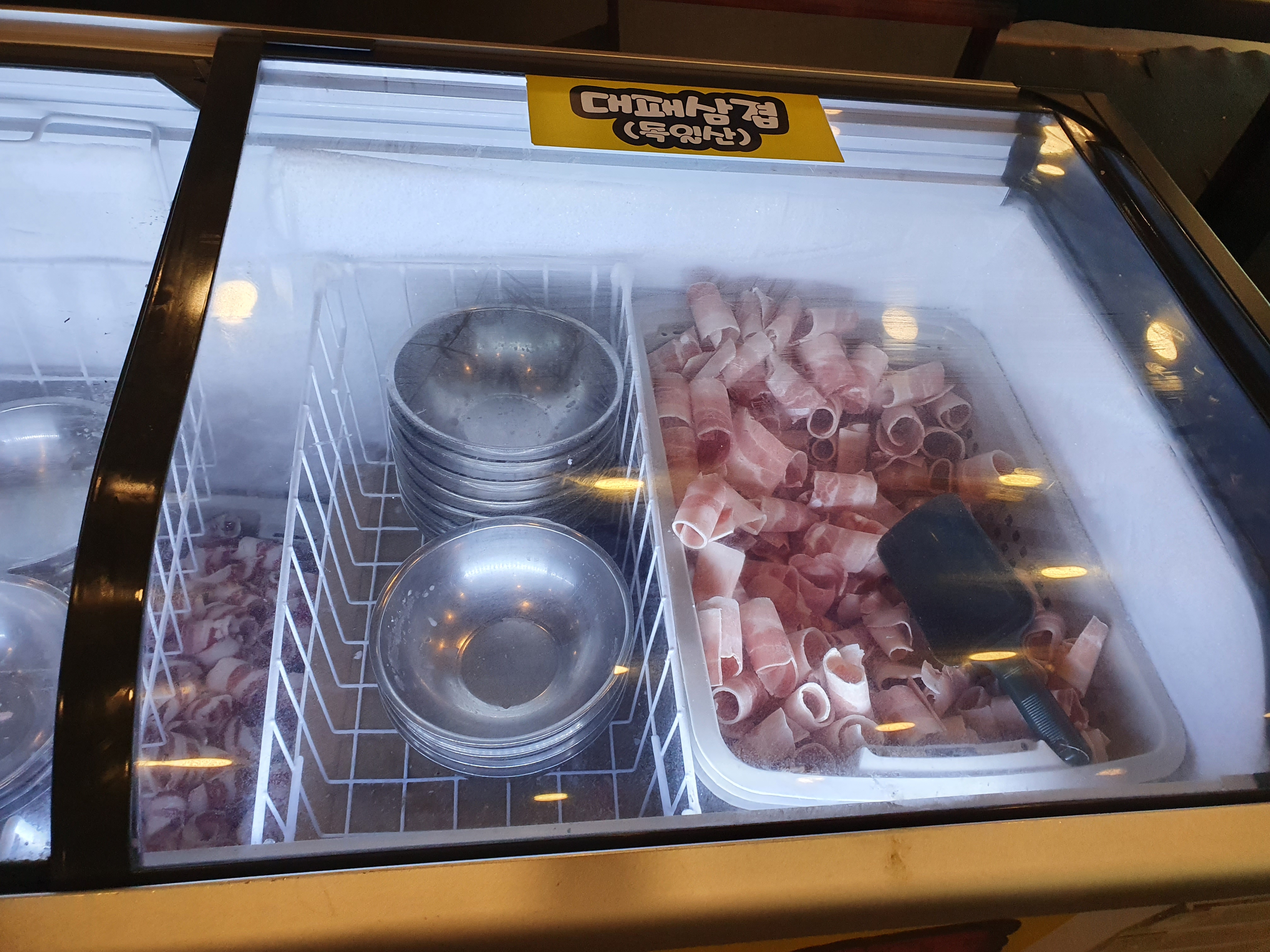 여기에 우삼겹과 대패삼겹이 냉동고에 쌓여있다. 개인적인 취향이기는 하지만 이것만 계속 실컷 먹어도 왠만큼 가성비는 나오지 않는가 하는 생각이 든다. 원래 두꺼운 고기 먹기 전에 얇은 고기로 입가심을 하기 좋긴 한데 그냥 이것만 먹어도 왠지 마음에 든다.