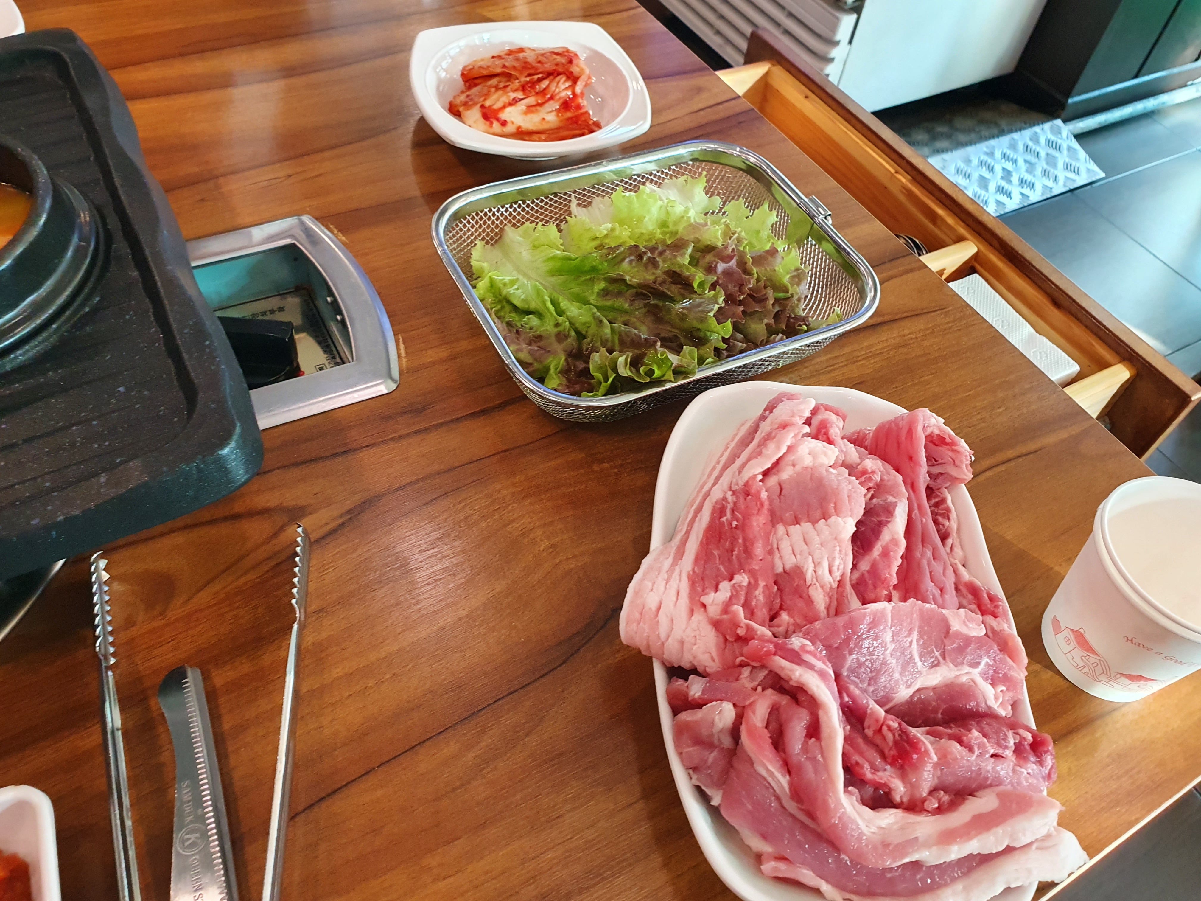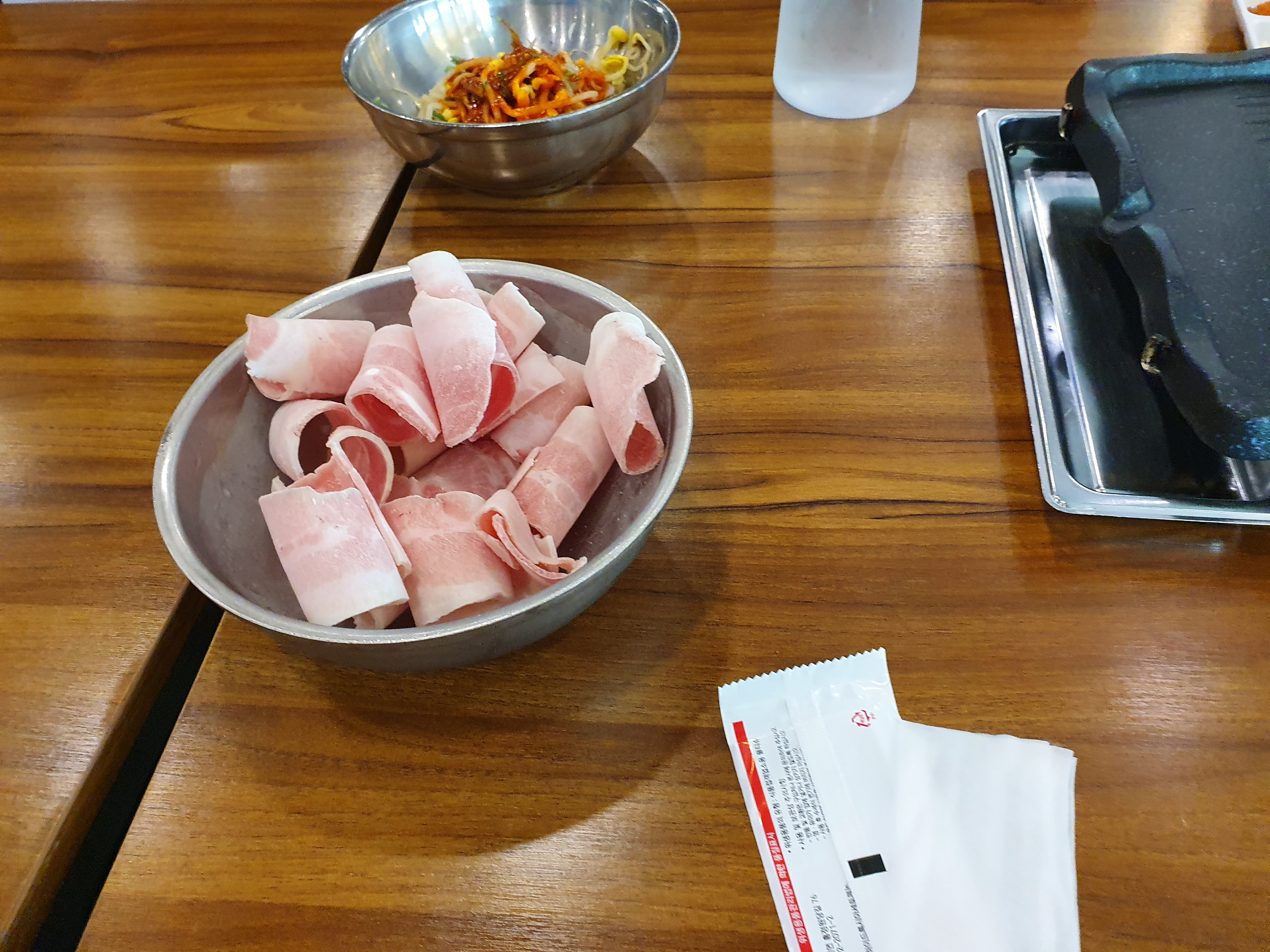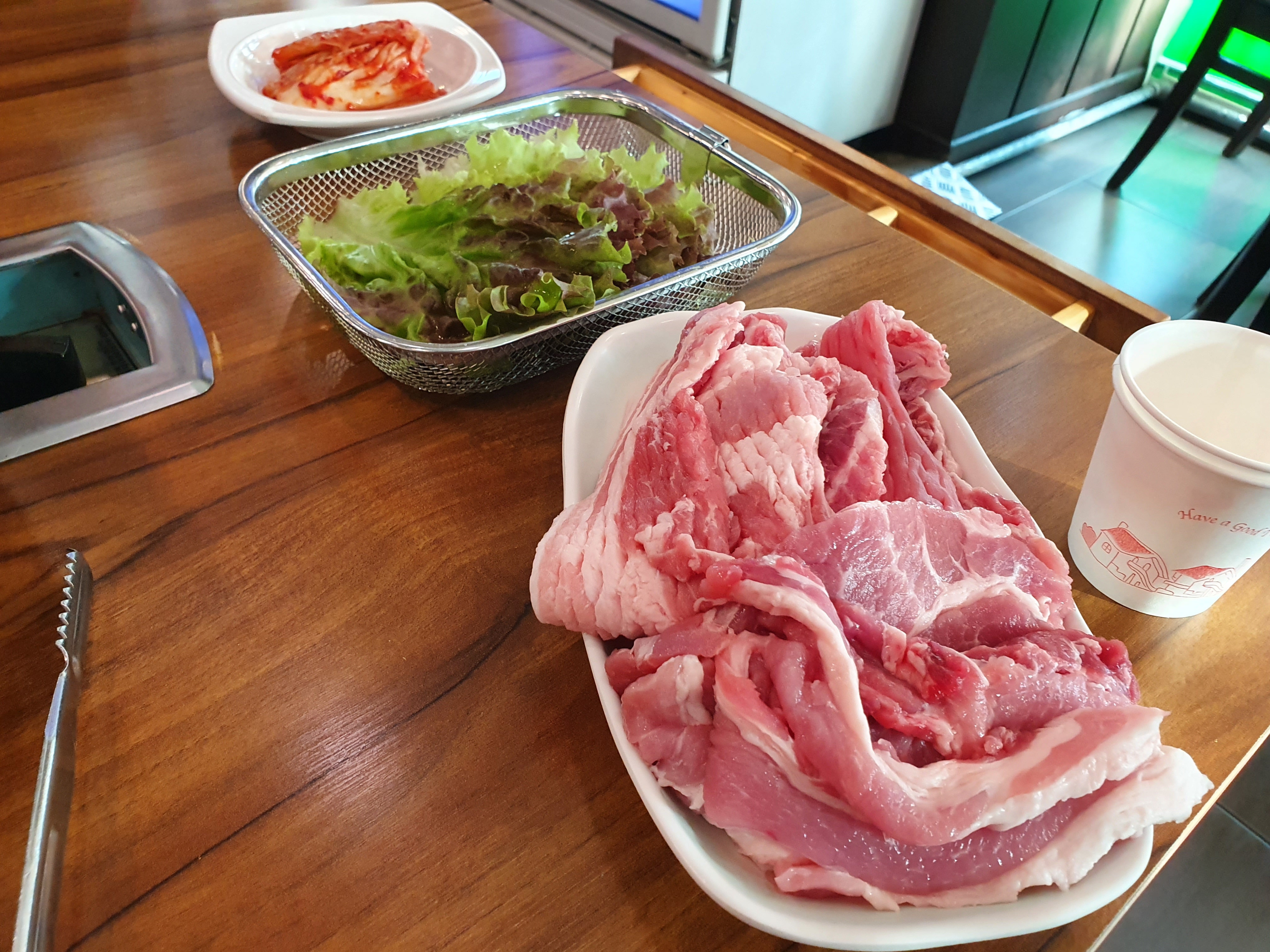 사실 처음부터 잔뜩 주시는 것이 무한리필집들의 공략인지는 모르겠지만 여기도 마찬가지로 이렇게 크게 많이 내어주신다. 육질도 그렇고 언뜻보기에도 괜찮은 수준이라서 기분은 좋다. 다만 이걸 다 먹고 나면 내가 좋아하는 대패삼겹은 많이 먹기 힘들다는 결론이 나오기도 하기 때문에 행복한 고민을 좀 해보게 한다.