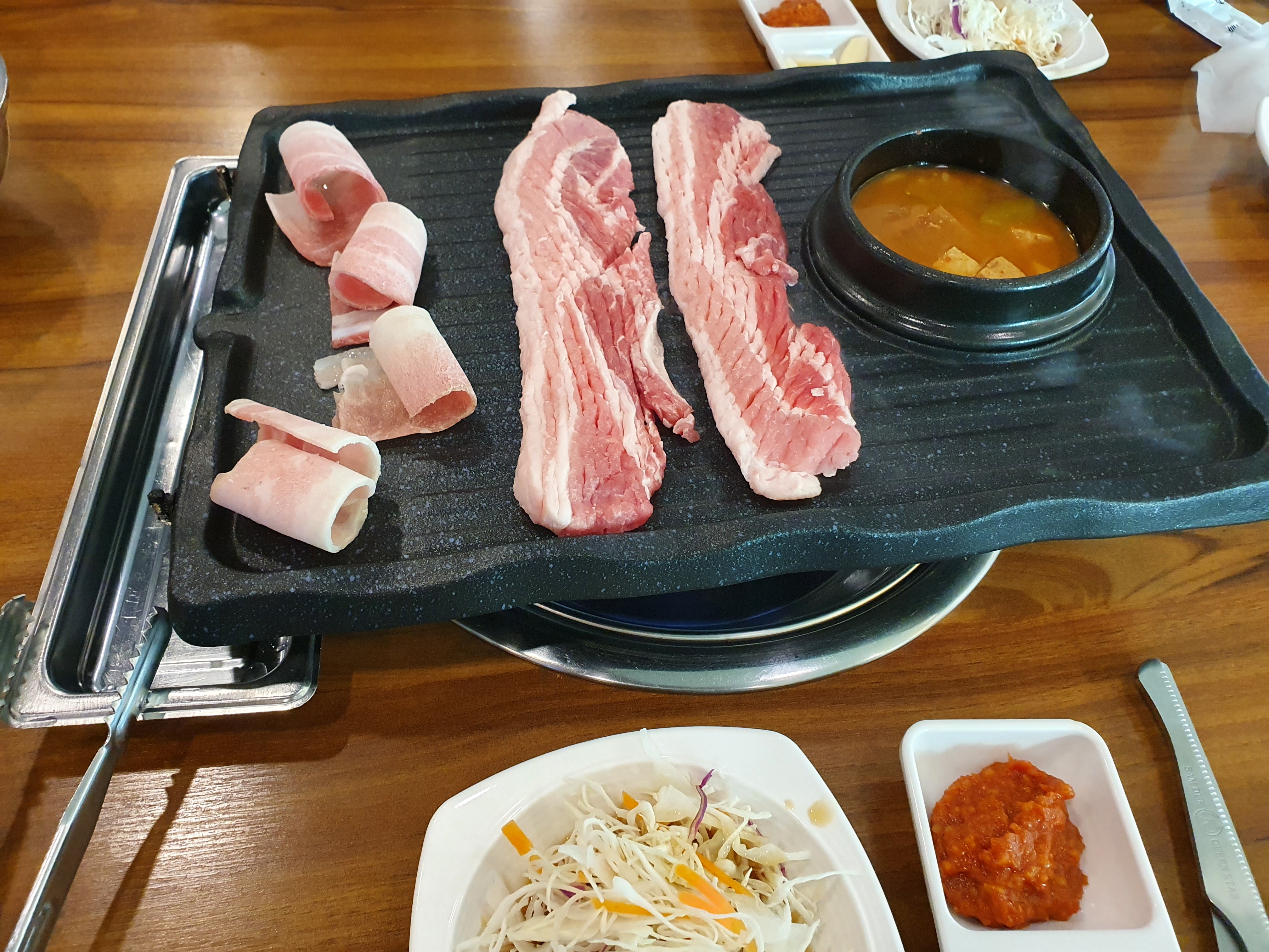 불판을 조금씩 달구다가 뜨거워지면 올려놓는다. 내가 좋아하는 대패삼겹이랑 같이 기본으로 나오는 고기랑 함께 해서 먹는다. 된장찌개도 셋팅을 해주시는데 맛은 보통이였다. 확실히 고기는 뜨거운 불에 촥촥 해서 먹어야 제맛이라는 생각이 든다.