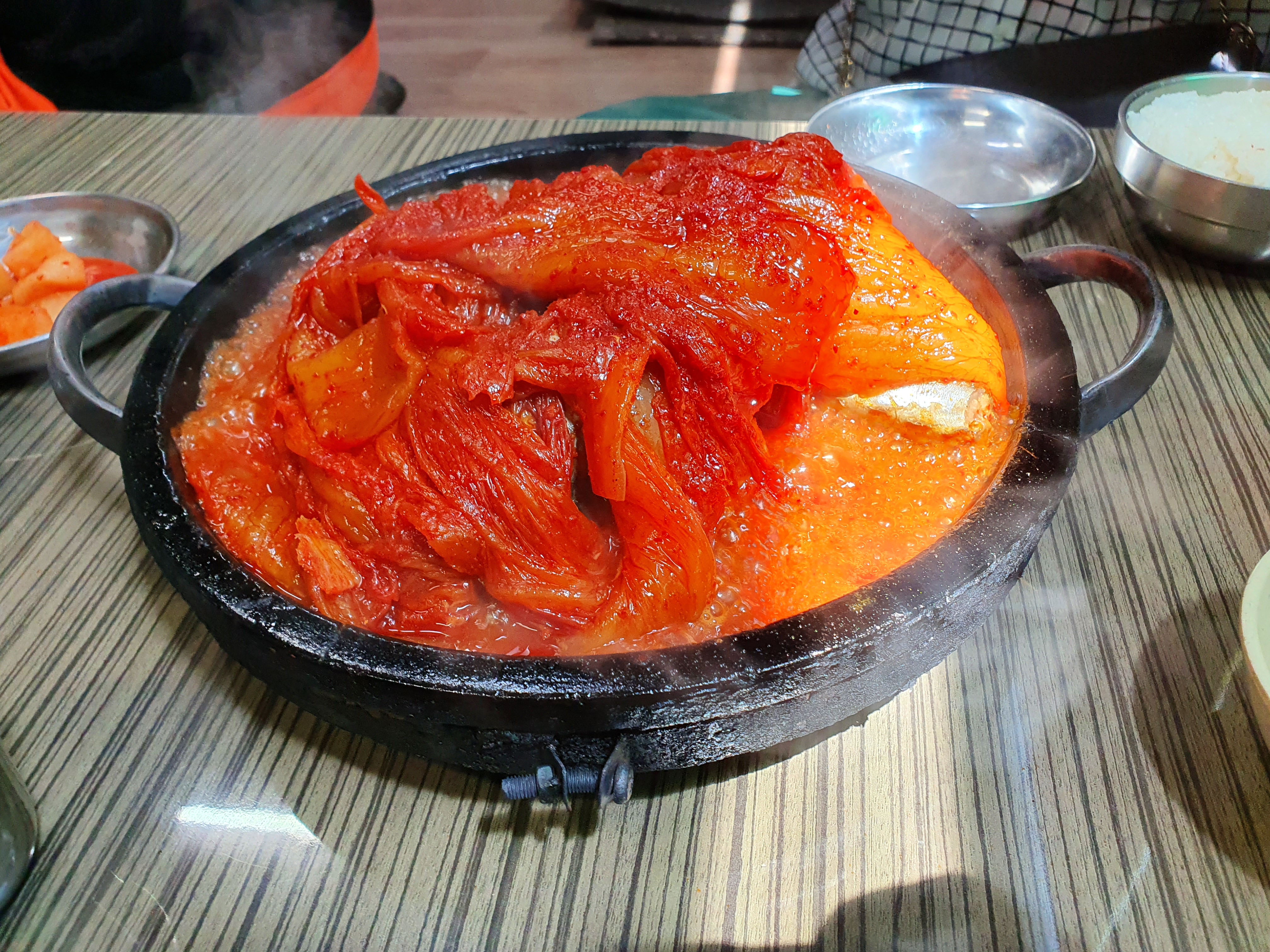 뜨끈한 돌판위에서 끓어오르는 열기가 상당합니다. 금방이라도 열기가 쑥쑥 하늘로 올라가는 모습을 보니 간단하게 보기만 해도 입맛을 돋구는 그런 비주얼이라고 할 수 있습니다. 묵은지를 좋아하시는 분들이라면 거의 틀림없이 사랑할 수 밖에 없는 구리맛집이라고 할 수 있습니다.