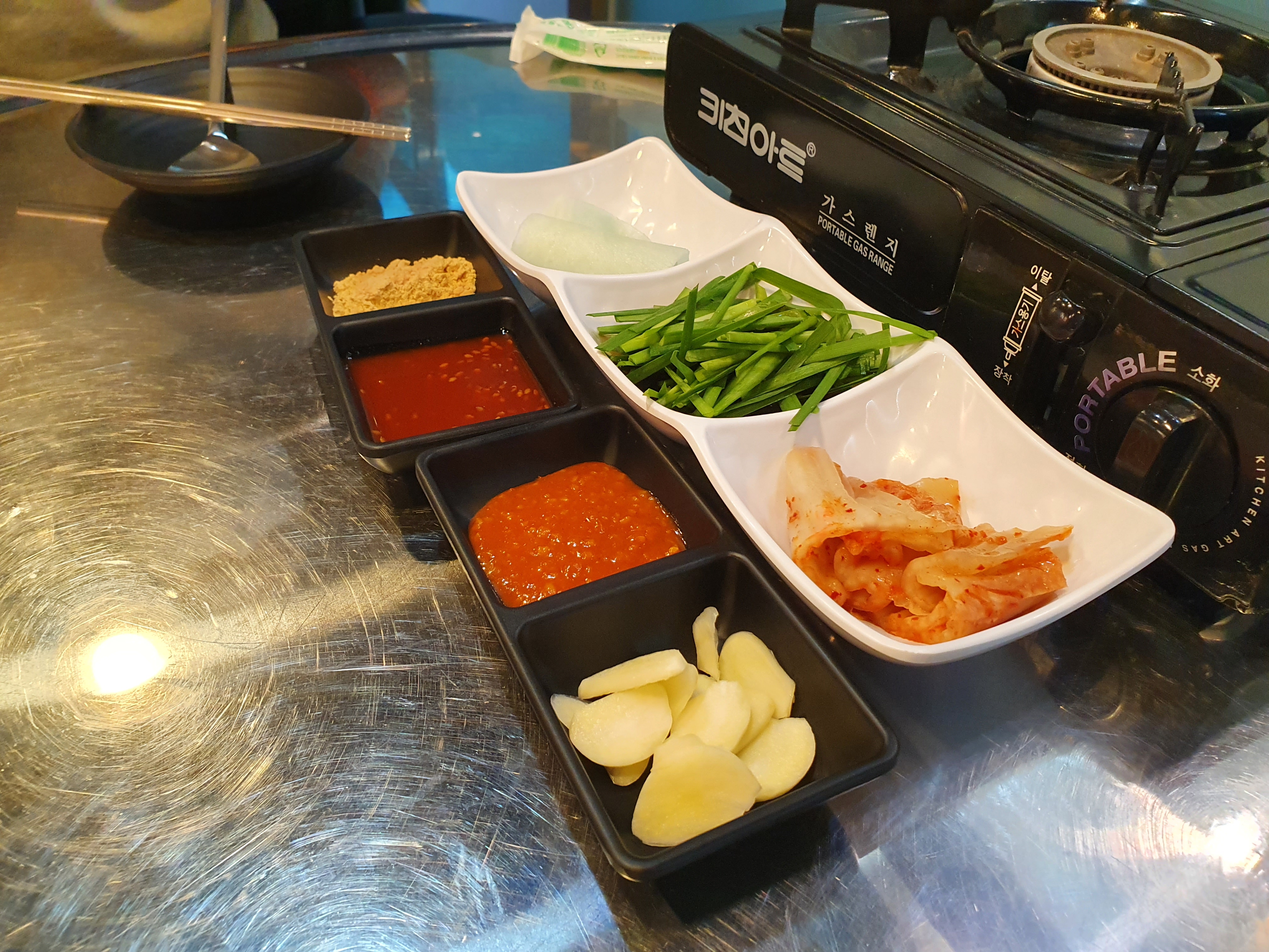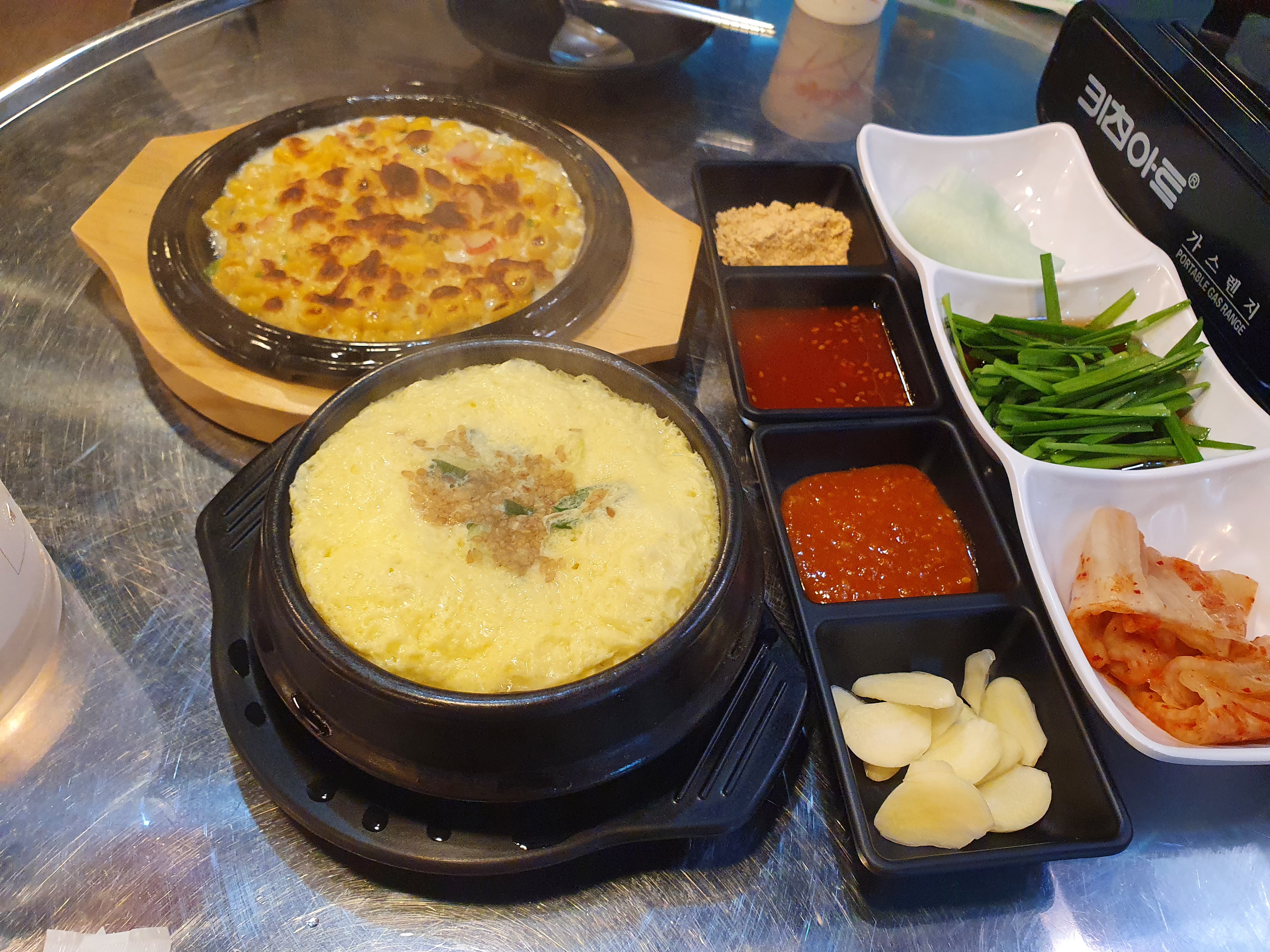 닭갈비가 나오기 전에 안에서 왠만큼 조리를 해주신다음에 나오기 때문에 나오는 시간이 한 10~20분 정도 걸리더라구요. 그래서 이전에 이렇게 반찬들 나와주시고, 계란찜과 콘치즈가 이렇게 살포시 주시네요. 배고픈 허기를 달달하게 채워주는데 좋습니다.