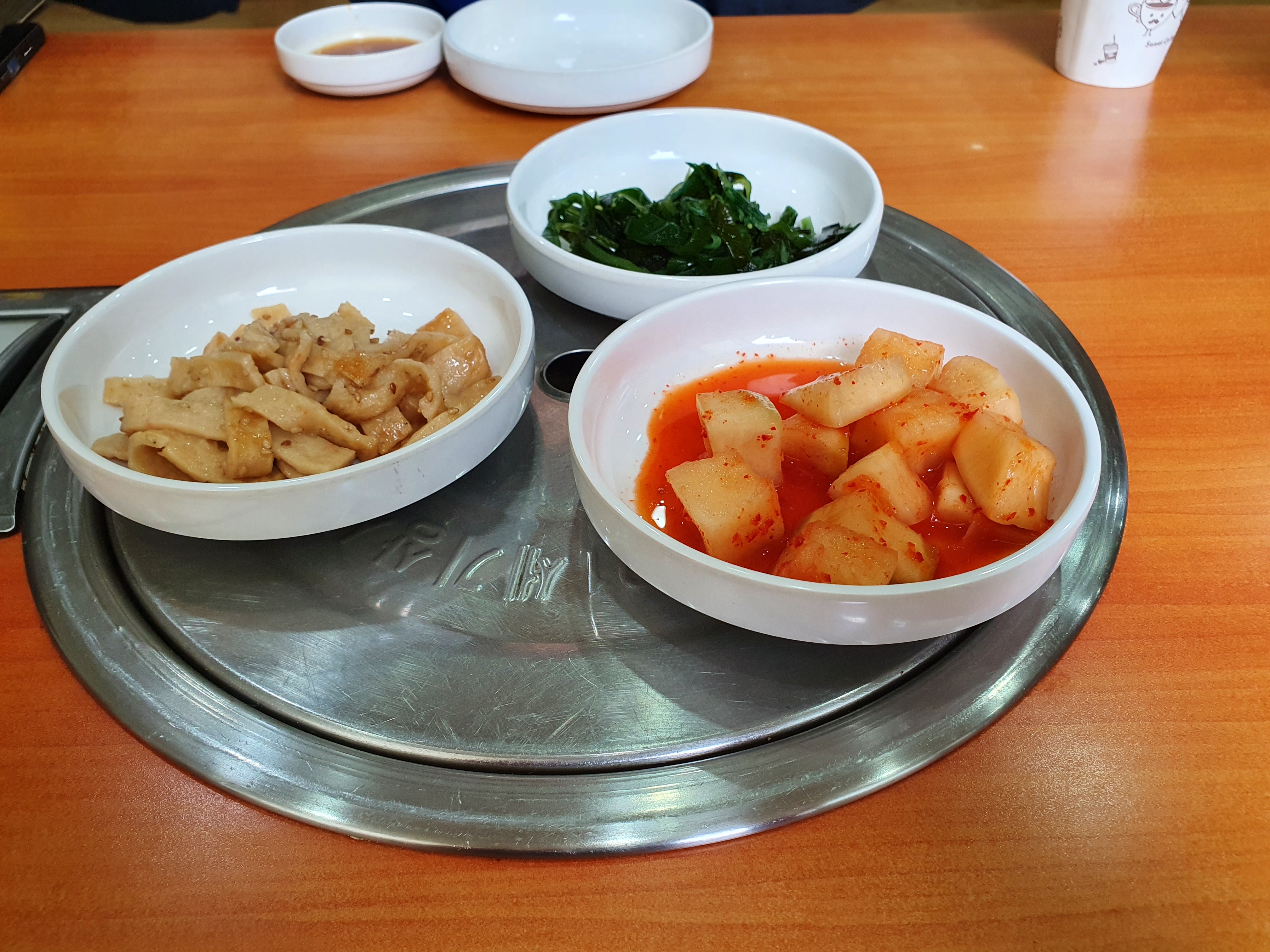 기본 찬에는 별다른 것 없이 3가지가 나왔습니다. 어묵반찬과 깍두기 그리고 시금치 간결하게 해서 나왔습니다. 화려한 찬들을 원하시는 분들에게는 별로 일 수도 있겠다 싶기도 합니다.