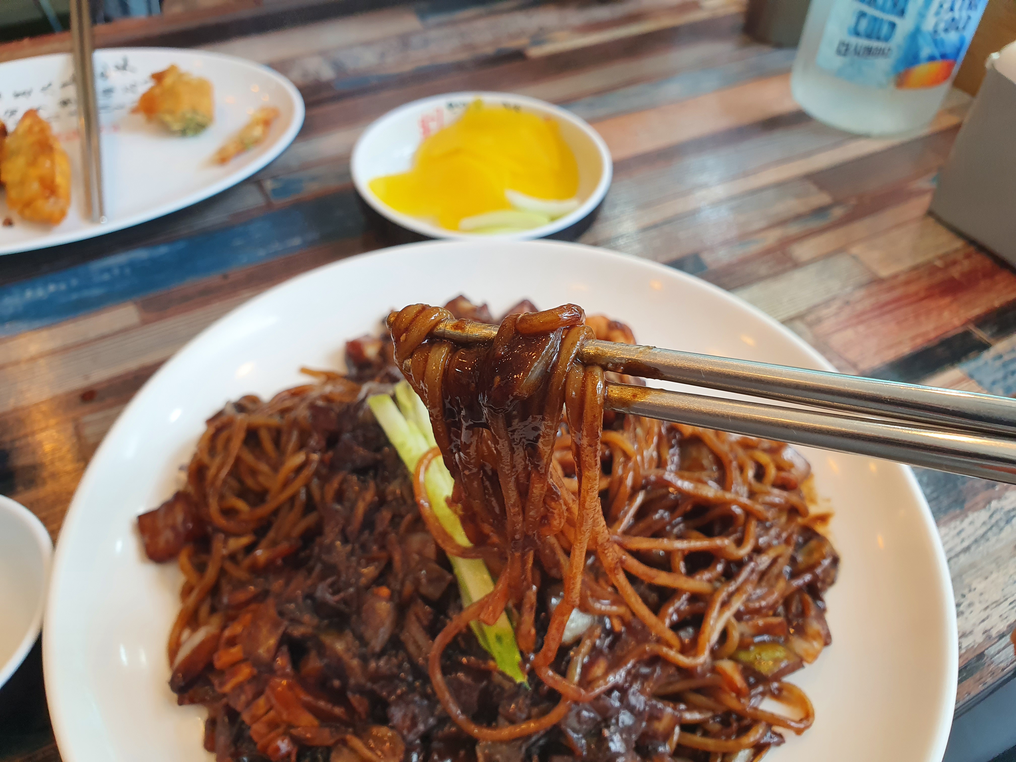 쟁반자장이 나왔습니다. 해물도 적당하게 들어있고 양념도 진하게 나오는 편이라서 입에서 딱 맞는 수준이였습니다. 감칠맛 날 정도로 입안에서 행복하다고 말을 하는 정도였습니다. 역시 제 기준으로는 일반짜장> 간짜장 > 쟁반짜장 이 순서대로 맛있는 것 같습니다.