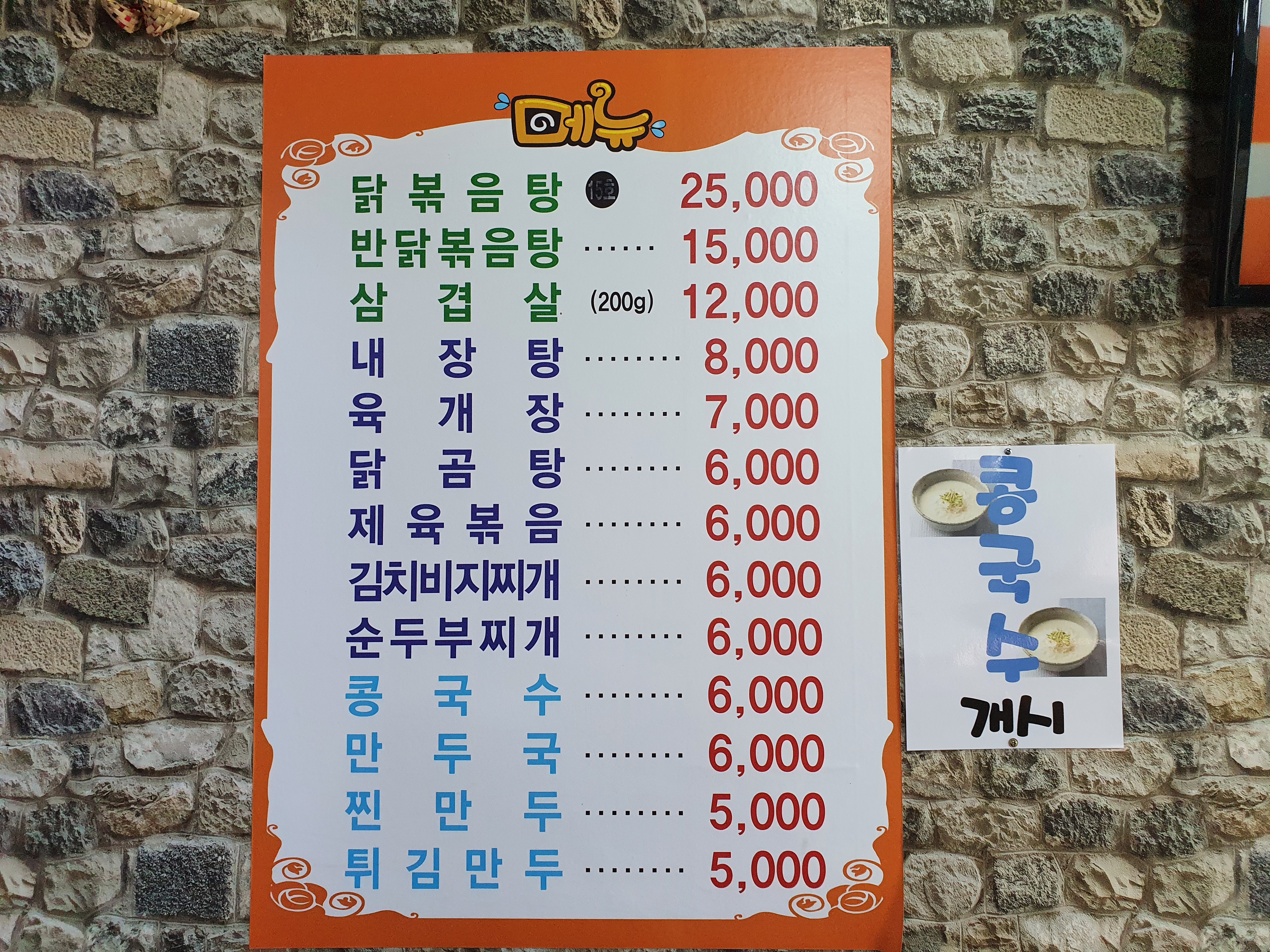 메뉴를 보면 적당한 가격을 가지고 있고 적당한 메뉴들이 있다. 닭볶음탕을 주력으로 하실려고 하신 듯 하다 그래서 사랑방 순대국 간판을 아직 교체를 못하신 듯 하다.