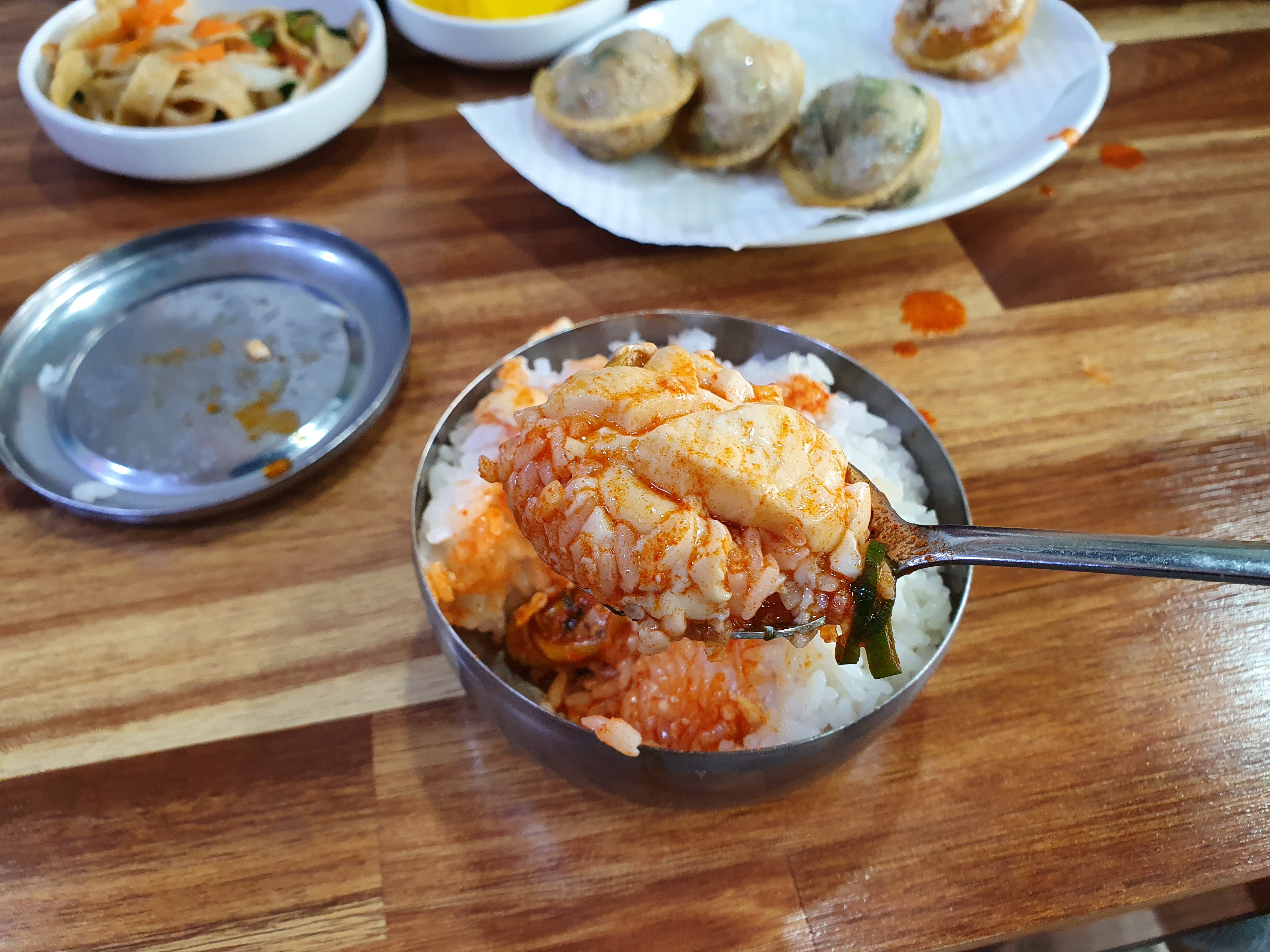 일반 군만두가 아닌 이런 손만두를 튀겨서 주셨는데 고기랑 김치랑 반반으로 해서 튀겨서 주셨다. 이게 은근히 꿀맛이다. 튀겨서 고소함이 더 살아나면서 좋았고 미리 튀겨놓거나 하지 않고 그때 그때 튀기기 때문에 좋았다.