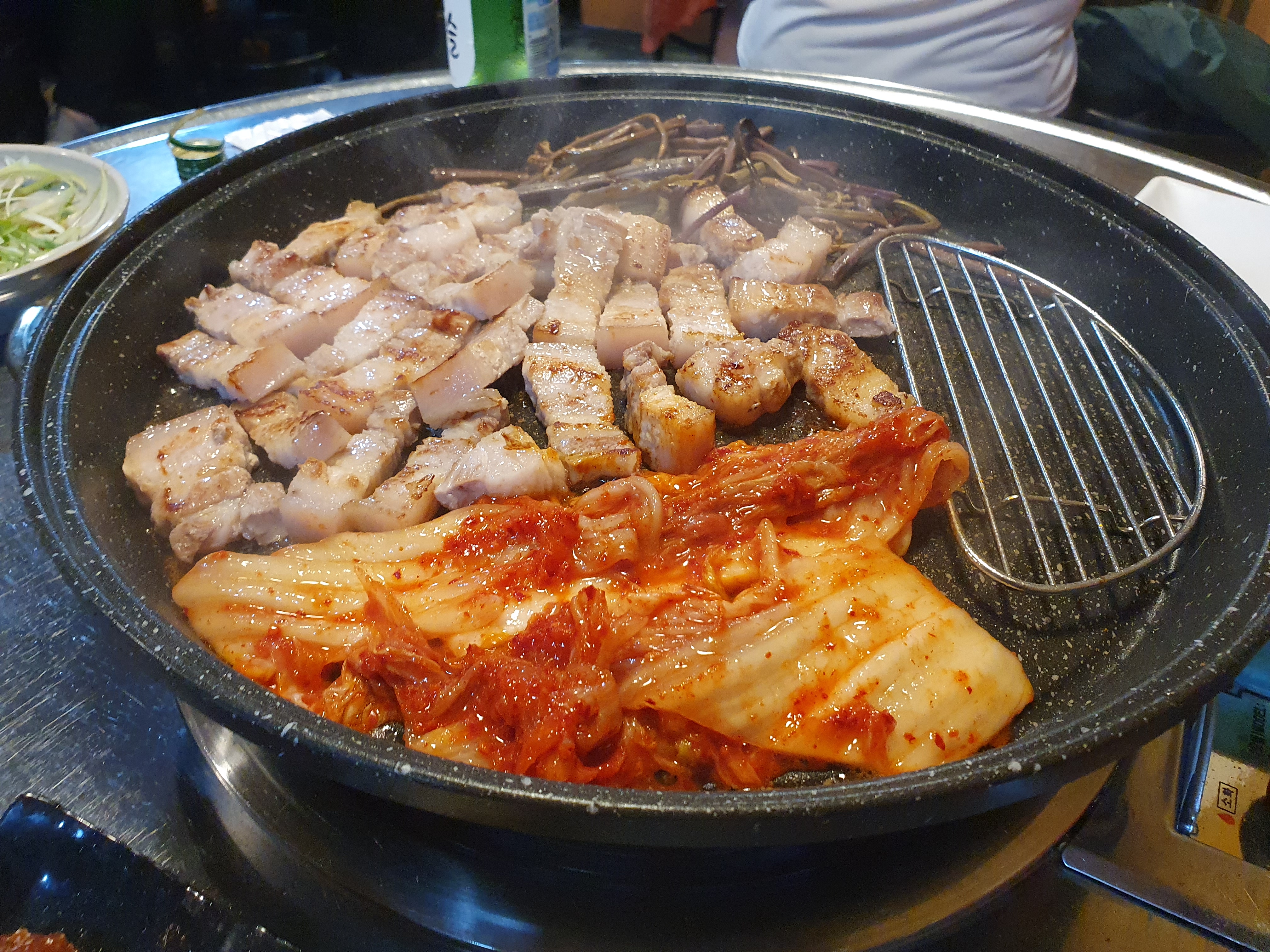 함께 내어주신 고사리하고 김치하고 삼겹살하고 야들야들 하게 굽습니다.