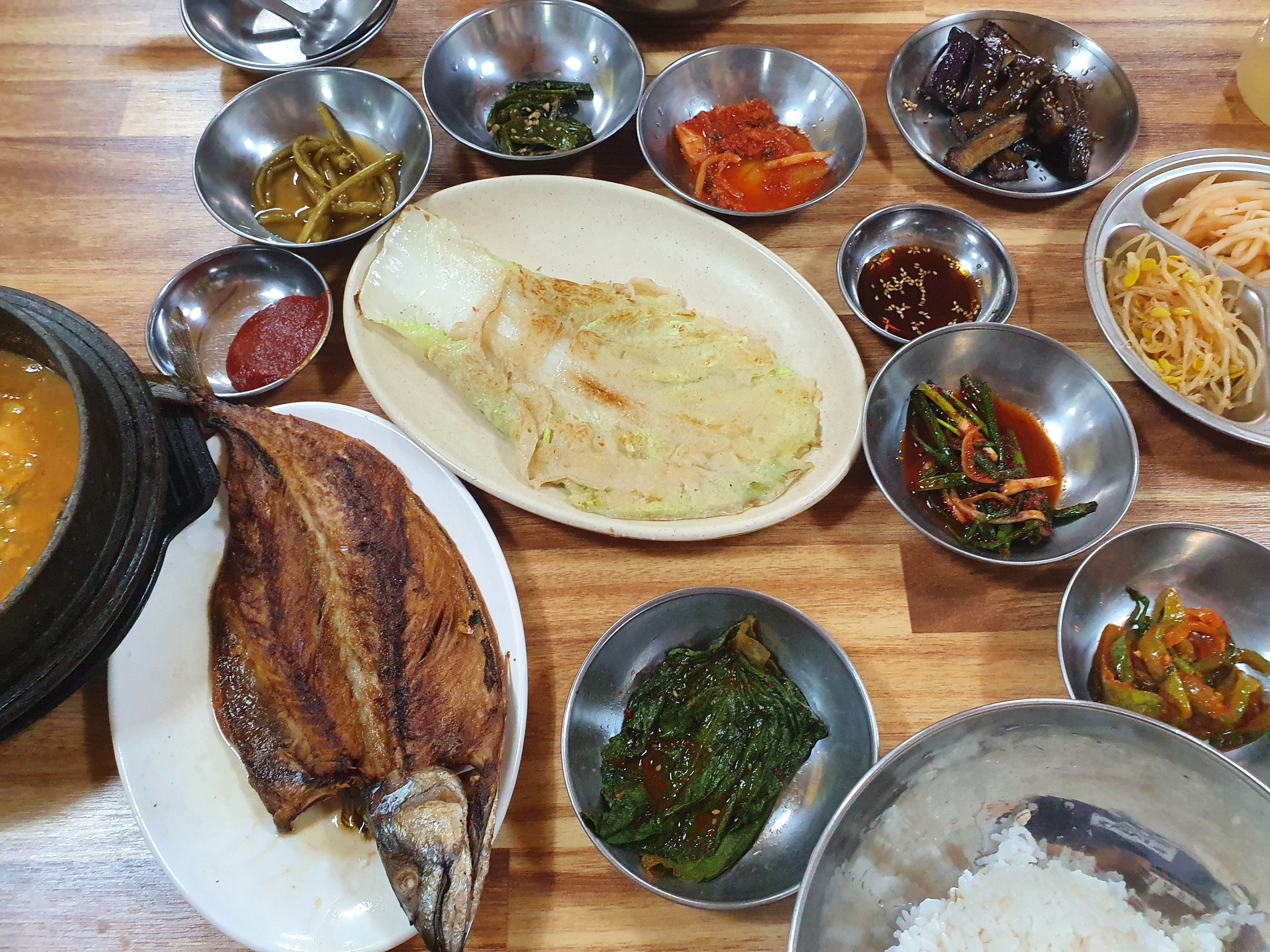 일단은 정식으로 식사를 하게 되면 고등어 구이가 하나 나옵니다. 여기서 뭐 먹어주는 것 같습니다. 잘 구운 고등어는 이런 시골에서 먹었을 때 더 운치를 더해주는 것 같습니다. 나머지 밑 반찬들이야 때에 따라서 조금씩 변하지 않을까 하는 생각이 듭니다. 구성은 다양해서 나쁘지 않게 잘 차려진 한상이였습니다.