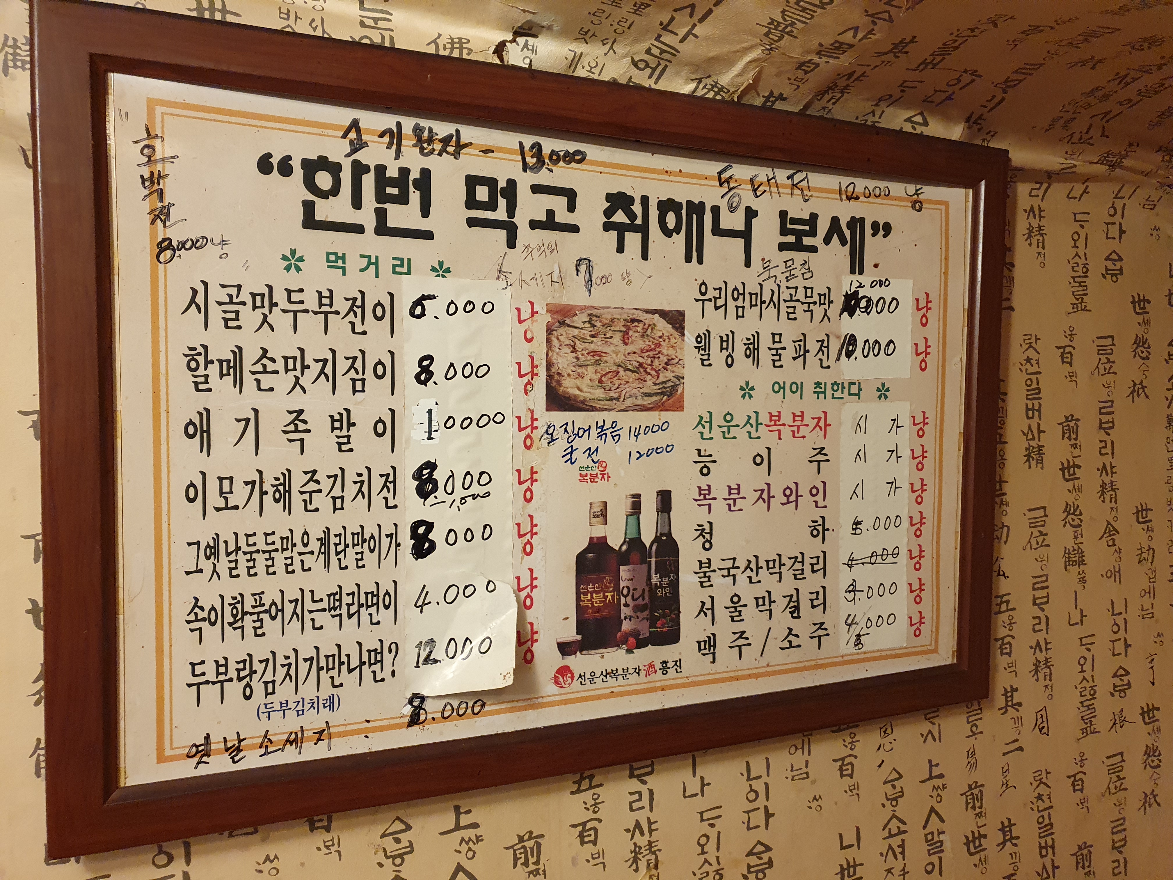 옛날에 만든 메뉴판인데 계속에서 여기도 가격이 올라가고 있는 것 같다. 그래도 극단적으로 확 올리지는 않는 것으로 봐서 그냥 마음에 안정을 찾아가고 있다 여기에 왠만해서는 다 맛있을 것 같다는.. 사장님의 음식솜씨가 예사롭지 않다는 것이 너무나 느껴지게 만들었다