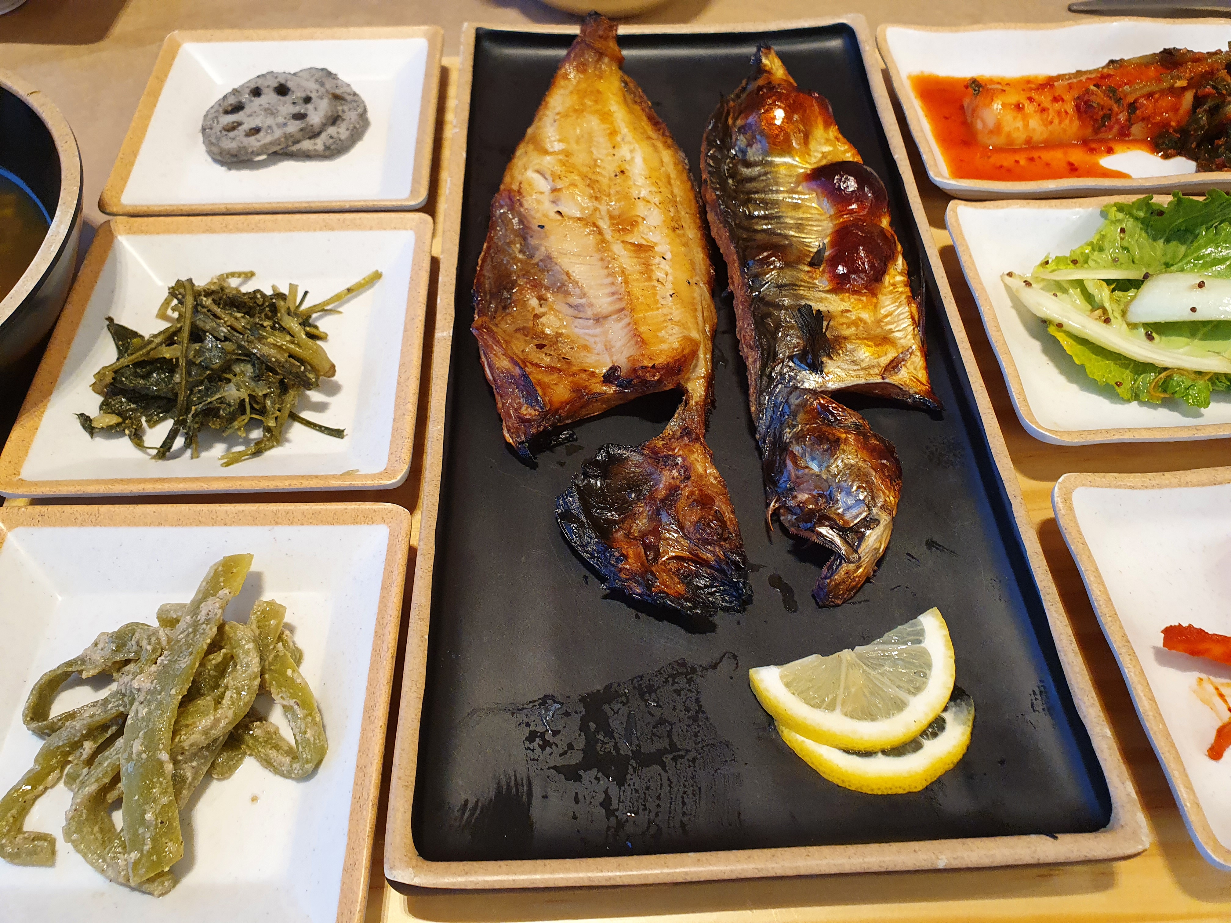전반적으로 깔끔하게 되어있고 한상 잘 차려진다는 느낌을 받았다 어르신들 모시고 오기에도 나쁘지 않아 보였다 왠만하면 다들 잘 먹지 않을까 싶을 정도로 깔끔하면서 생선구이도 바싹 잘 구워졌다. 이거 굽는 것도 방식에 따라 어떻게 맛이 나누어지기는 하는데 개인적으로 내 입맛에는 맞았다. 양이 조금 아쉽게 느껴질 뿐이였다