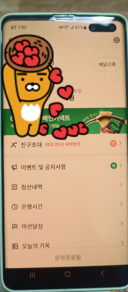 10분이면 뚝뚝 꺼지는 운행 종료를 당해본다면 콜도 없어서 별로인데 계속해서 띵띵하고 운행 종료가 된다. 그 사이에 운행이 되지 않는다면 자동으로 꺼지는 것인데 이거 왜 이렇게 만들었는지 다른 플랫폼은 기다리더라도 그냥 켜놓고 있으면 되는데 유달리 배민커넥트만 이렇게 되니까 켜기가 귀찮다는 생각이 저절로 들게 만들어진다.