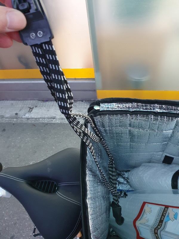 소소하기는 하지만 자전거 끈입니다. 고무줄처럼 늘어나는 끈인데요 어쩌다 이긴 합니다. 잘 사용을 안 해서 바닥에 넣어두기는 하지만 그래도 유용하게 한두 번씩 쓰일 때가 있습니다. 어떤 경우냐면 너무 많이 부피가 큰 녀석들을 담아두게 될 경우예요. 이런 경우 저는 음식의 경우에는 그냥 바로 포기를 합니다. 화면 하단에 자세하게 보면 작은 글씨고 취소 버튼이 있어요. 그래서 일단 저는 피자집은 그냥 콜 알람이 오면 바로 수락을 안 합니다. 예전에는 따로 피자 가방을 챙겨 다닐까 고민도 하기도 했지만 그냥 안 하는 게 속이 편했어요. 음식이 아니라 다른 보냉 가방이 필요 없는 부분들이라고 한다면 자전거 끈으로 묶어두거나 고정을 하게 되는데요. 한두 번씩은 쓰게 되는 일이 생깁니다. 필수는 아니지만 유용하게 사용을 해요