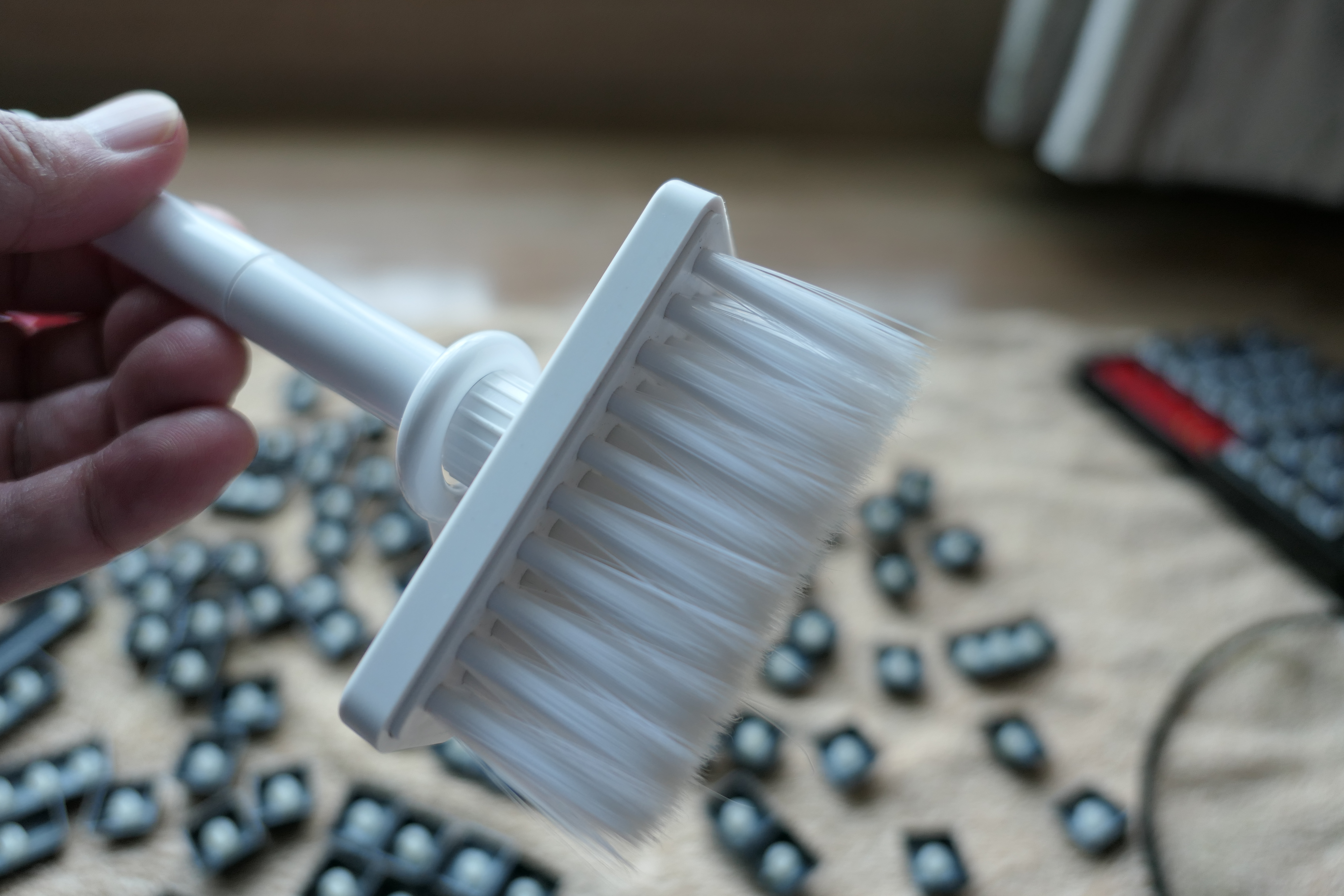 저렴한 느낌으로 구매를 했는데 빨간색 사고 싶었지만 재고가 없다고 해서 흰색으로 구매를 했다. 털은 살짝 빳빳한 느낌이 들었다 나름대로 키보드 청소를 하는 데 있어서 너무 부드러운 것보다 먼지를 딱 떨어줄 수 있을 정도로 빳빳함을 가지고 있기는 했다. 이 정도의 탄력이 가장 적합한 수준이라고 생각을 했다. 그리고 무엇보다 마음에 들었던 것은 넓이가 꽤나 넓은 편이라는 것이라 한 번에 쭈욱 털어낼 수 있다는 점이다.