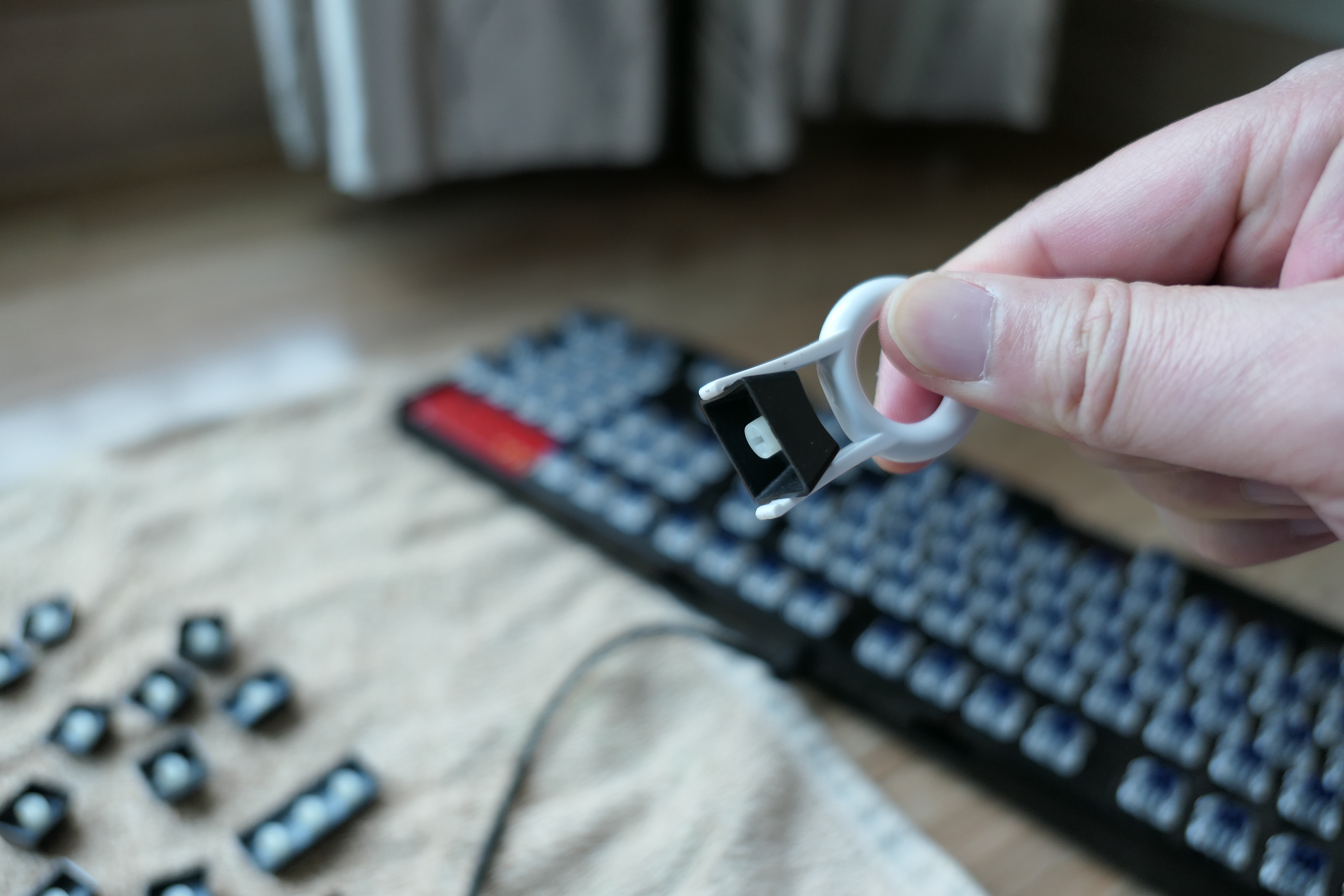 손이 작은 사람들은 손으로도 캡을 뽑을 수 있겠지만 보통의 성인이라면 굉장히 힘들다. 그래서 이런 뽑기 툴이 있어야 편하게 할 수 있다. 분명 처음 기계식 키보드를 샀을 때 받아서 어디 서랍 같은 것에 넣어둔 것 같았는데 없었다. 하나씩 드라이버나 이쑤시개로 뽑기는 힘들다고 생각을 했는데 다행히 키보드 청소 키트에 함께 있어서 수월하게 캡을 모두 뽑을 수 있었다.