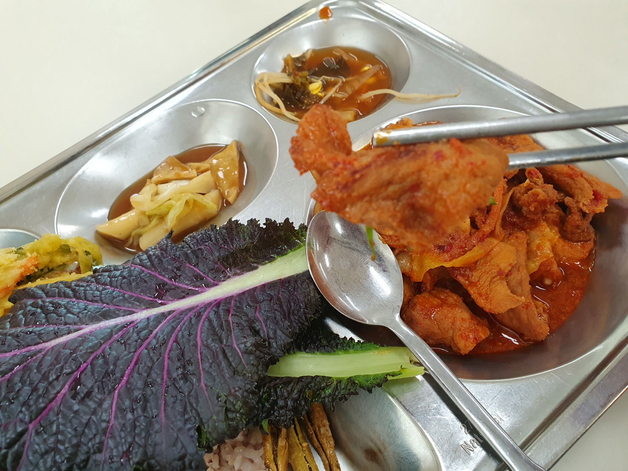 그리고 제육의 장점이라고 할 수 있는 다양한 쌈이 있어서 좋았습니다. 예전에 한식뷔페 가면 보통 그냥 상추나 배추 하나만 나오는 경우가 대부분이었는데 이 날은 겨자잎이 있어서 너무나 놀랐어요. 쌈도 잘 구성이 되어있어서 제육을 싸서 먹는 느낌이 너무나 좋았습니다. 이런 맛에 도서관으로 달려가는 것 아닐까요.