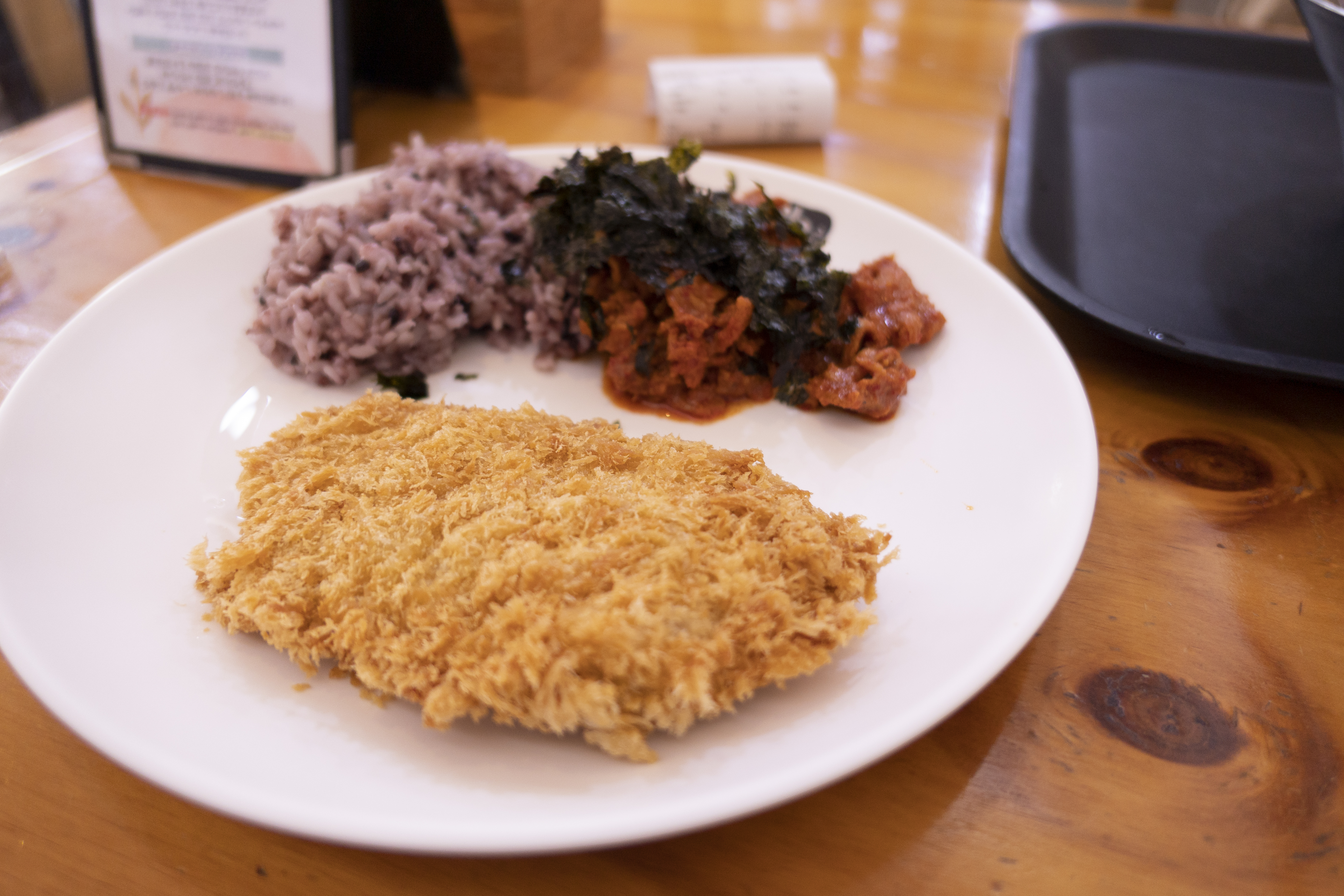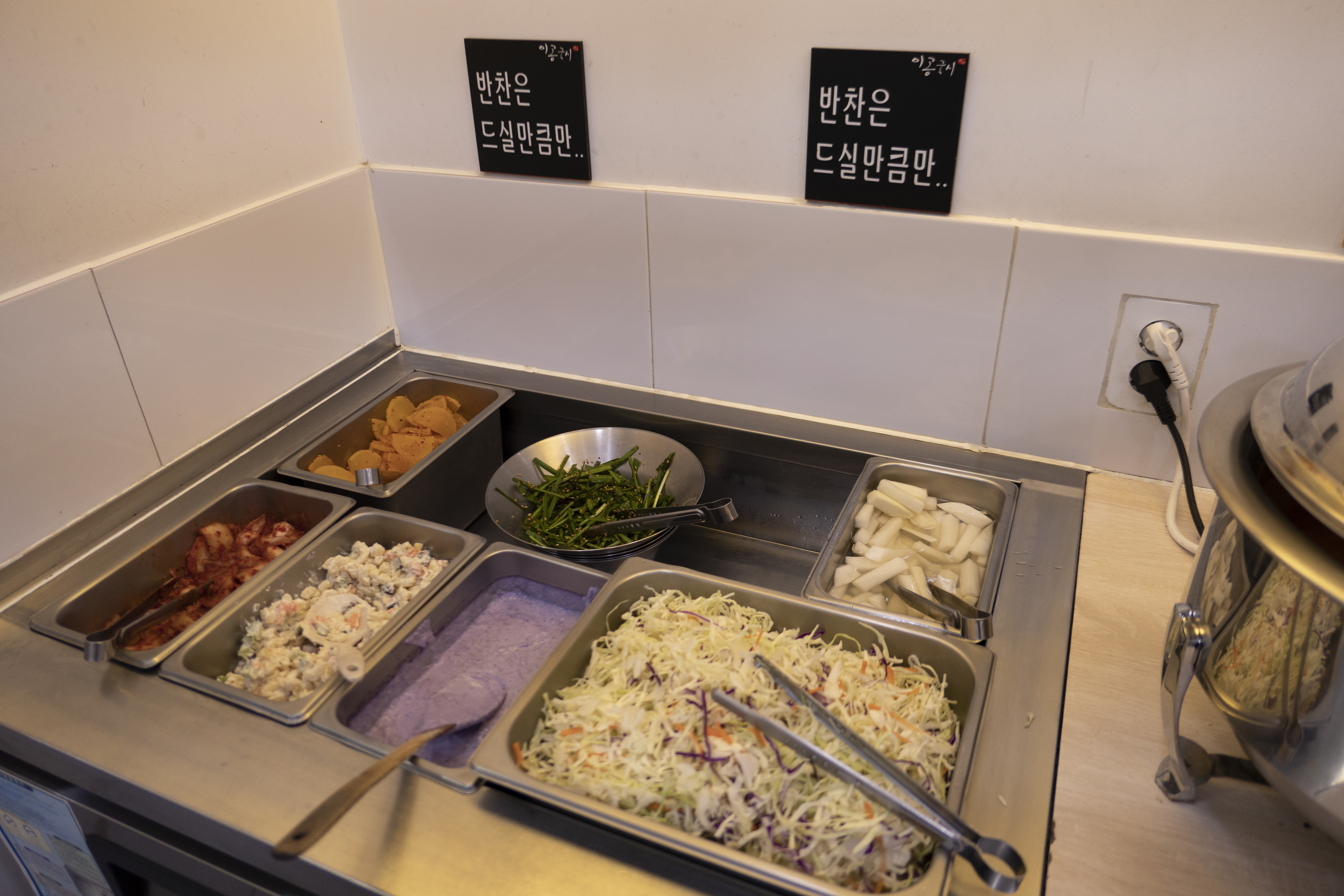 반찬들도 자기가 원하는 만큼 담을 수 있습니다. 처음부터 셋팅을 해주시는 것은 없고 한식뷔페처럼 생각을 하시고 자기가 먹을 만큼을 담아서 오면 됩니다. 반찬들의 맛은 그냥 소소하다고 보면 될 것 같습니다. 그냥저냥 먹을 만한 수준의 일반적인 반찬 맛을 가지고 있습니다. 뭐 여기에 떡볶이도 있는데 여기 와서 떡볶이까지 먹을 정도로 감동적일 수준은 아니어서 반찬과 떡볶이는 웬만해서는 담질 않습니다. 담는다고 한다면 깍두기 몇 조각 정도 수준이네요. 야채를 많이 먹어야 하는데 말이에요.