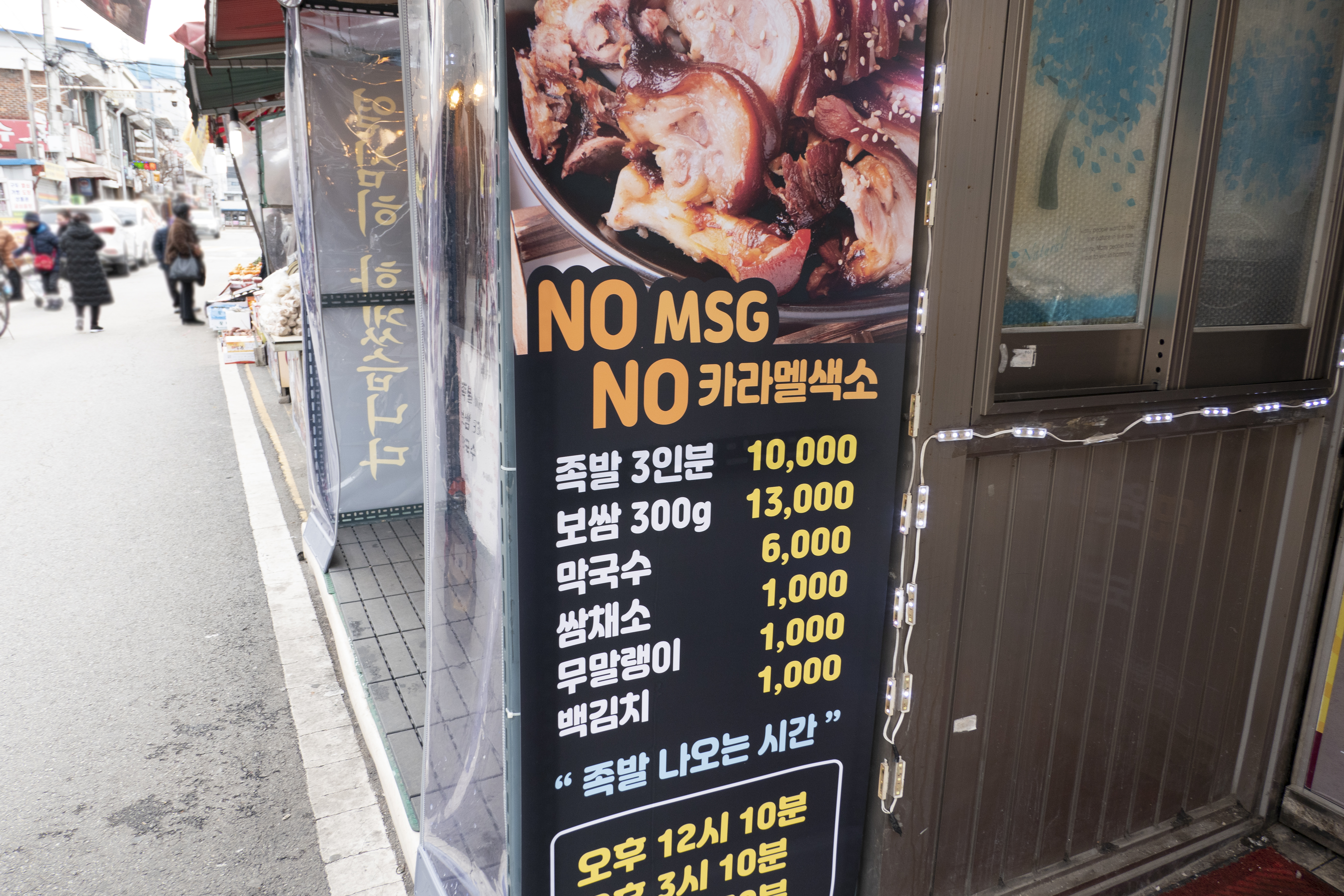 족발 600g 하고 그리고 쌈채소, 무말랭이 이렇게 주문을 하였습니다. 이렇게 먹어도 12000원이라는 것이 믿기지 않을 만한 가격인 것 같습니다. 족발이 나오는 시간이 이렇게 정해져 있기 때문에 이왕이면 시간을 맞추어서 가게 되면 더 따뜻하고 맛있는 족발을 먹을 수 있지 않을까 하는 생각도 들고 시간이 조금 더 걸려서 줄을 서게 될 수도 있을 것 같습니다. 전반적으로 가격이 다 착하게 구성이 되어 있는 것도 좋고 잘 먹지 않는 다양한 구성보다는 자기가 원하는 반찬들만 추가를 해서 먹을 수 있는 것도 상당하게 합리적인 것 같습니다. 막국수도 너무나 좋아하는 편이기는 한데, 집으로 돌아가는 길이 한 40분 정도 걸리기 때문에 괜히 가다가 다 불어 버릴 것 같아 차마 막국수는 주문을 하지 못했습니다. 근처에 사신다고 하면 또 막국수 하고 족발하고 같이 먹는 맛이 일품이기 때문에 같이 드시는 것도 좋을 듯합니다.