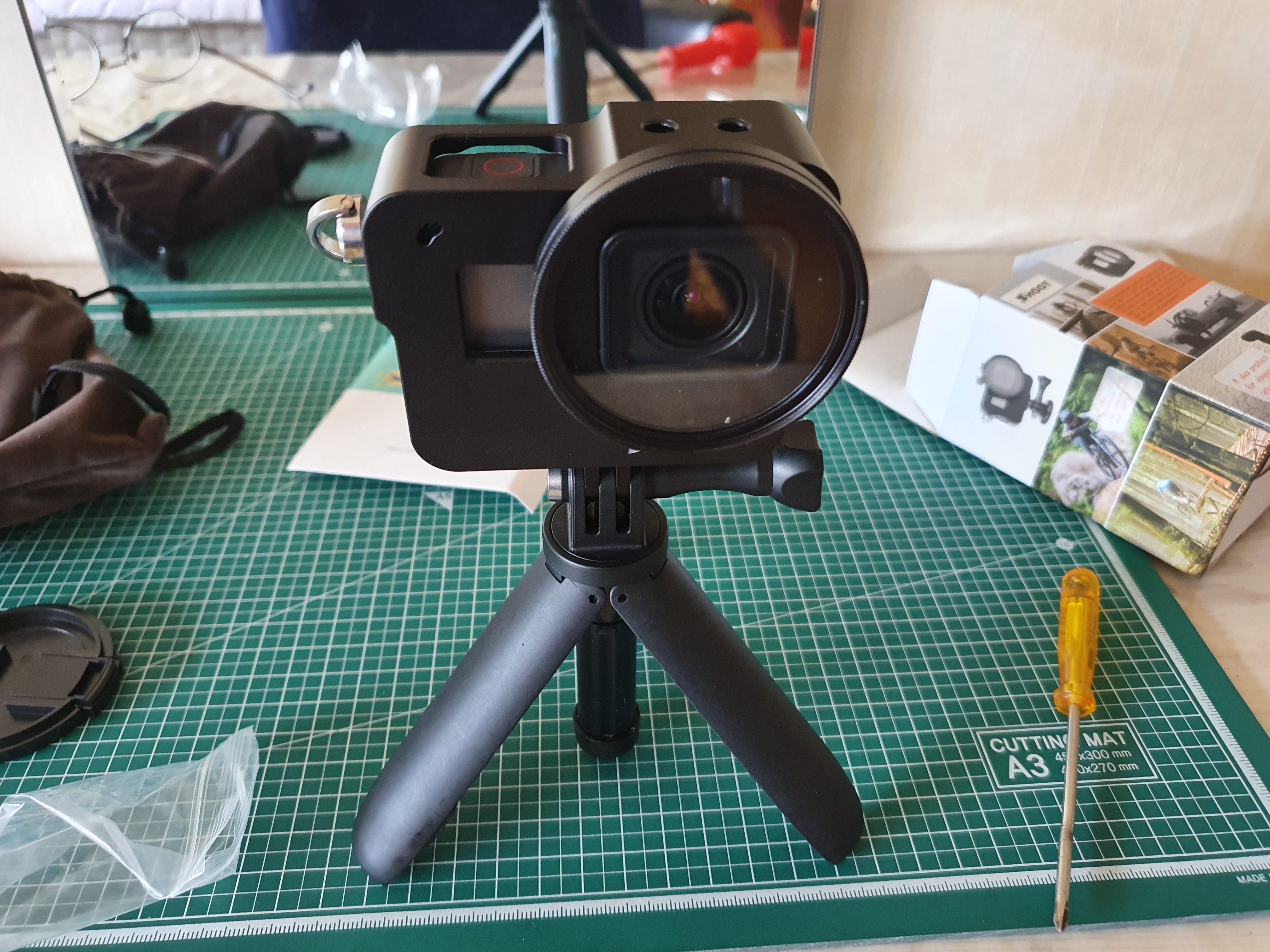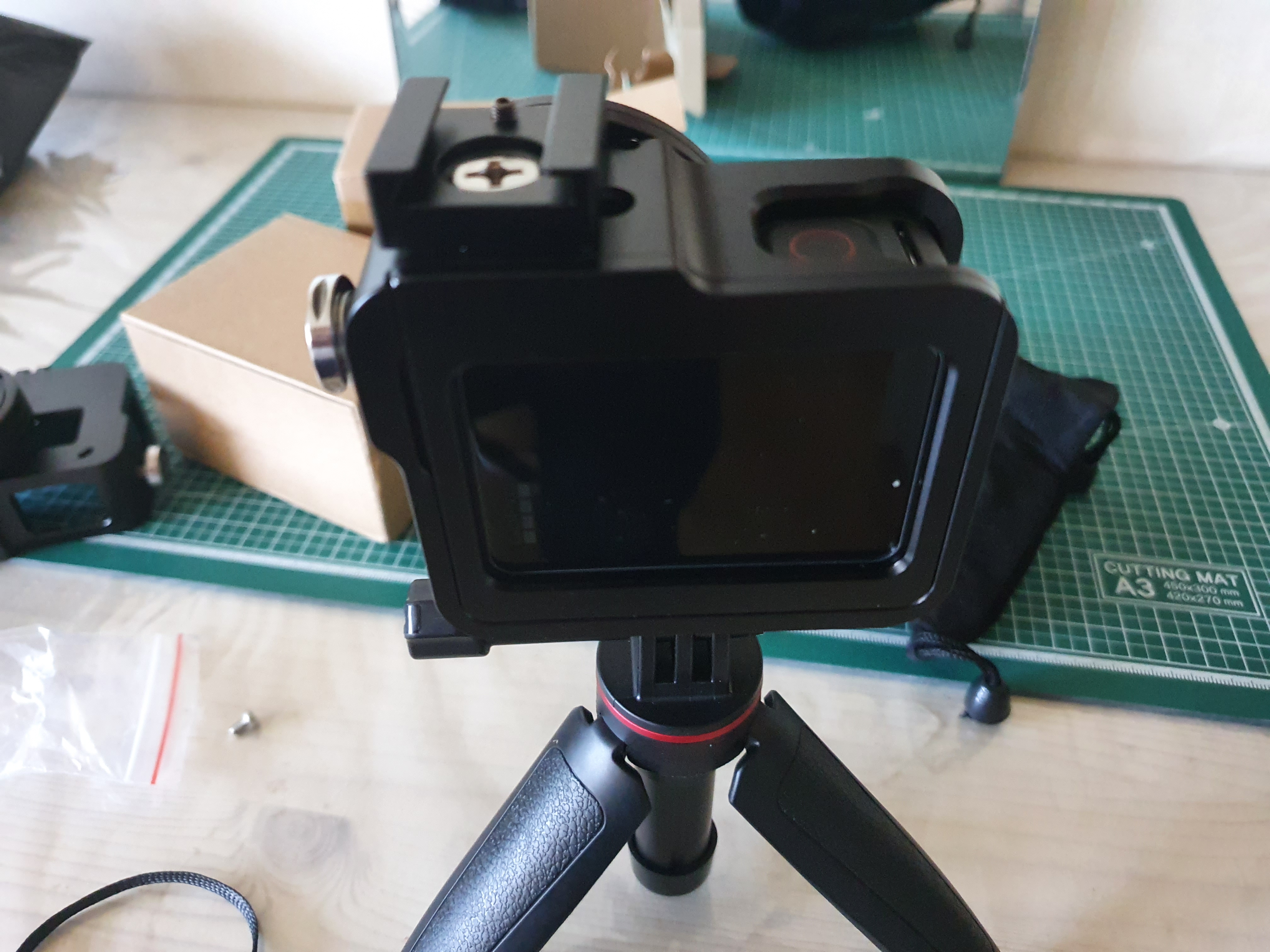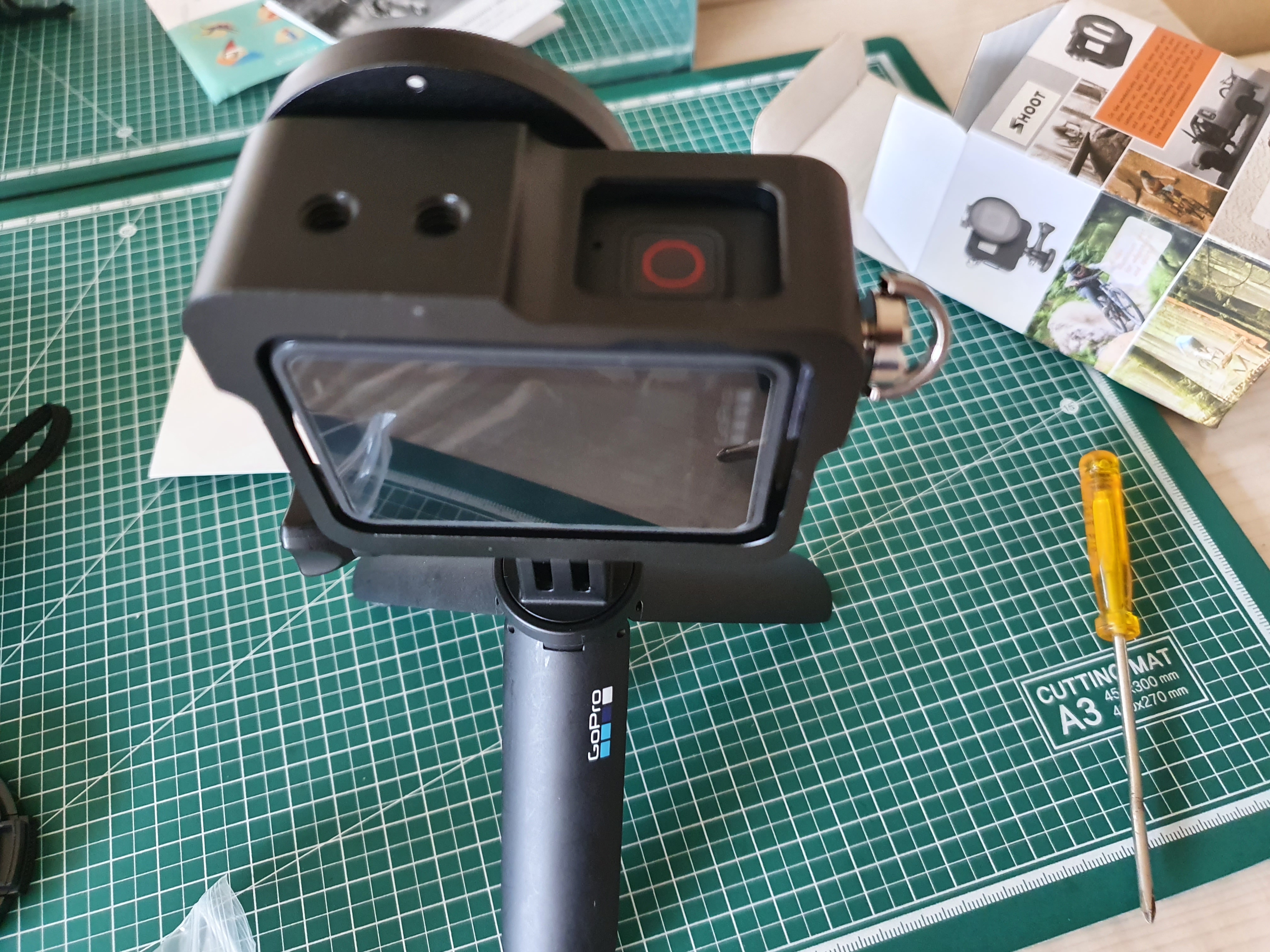 이건 고프로 8의 알루미늄케이스인데 값이 조금 더 나간다고 이렇게 천조각 사은품도 넣어주셨다. 단단하게 사용을 할 수 있도록 되어있고 8용 제품은 디스플레이족에 닫을 수 있는 구조가 되어있다. 위의 제품은 그냥 꽂기만 하고 돌리는 거라 단단하게 잡아줄까 걱정이 되었는데 이건 그럴 필요가 없다.