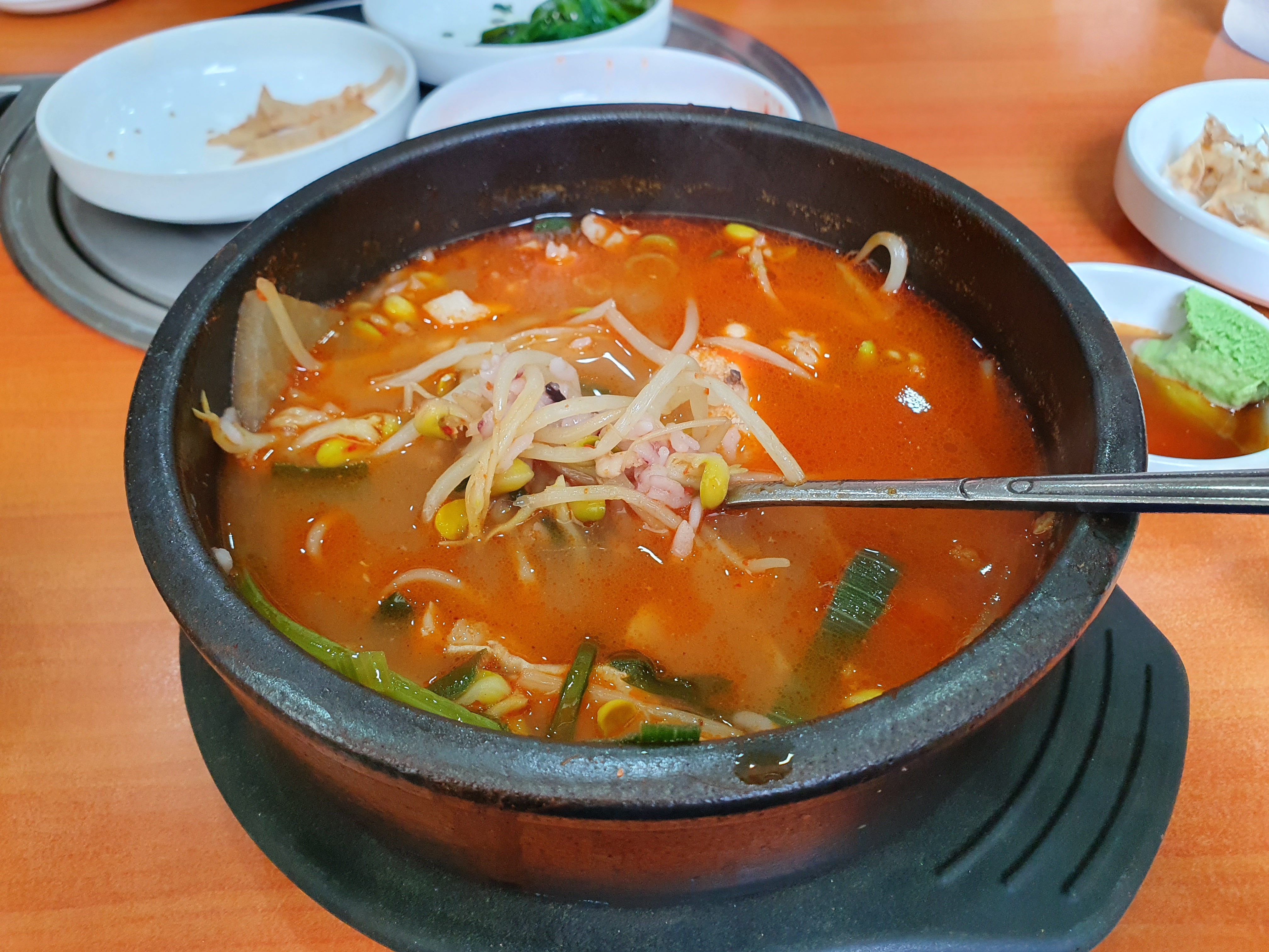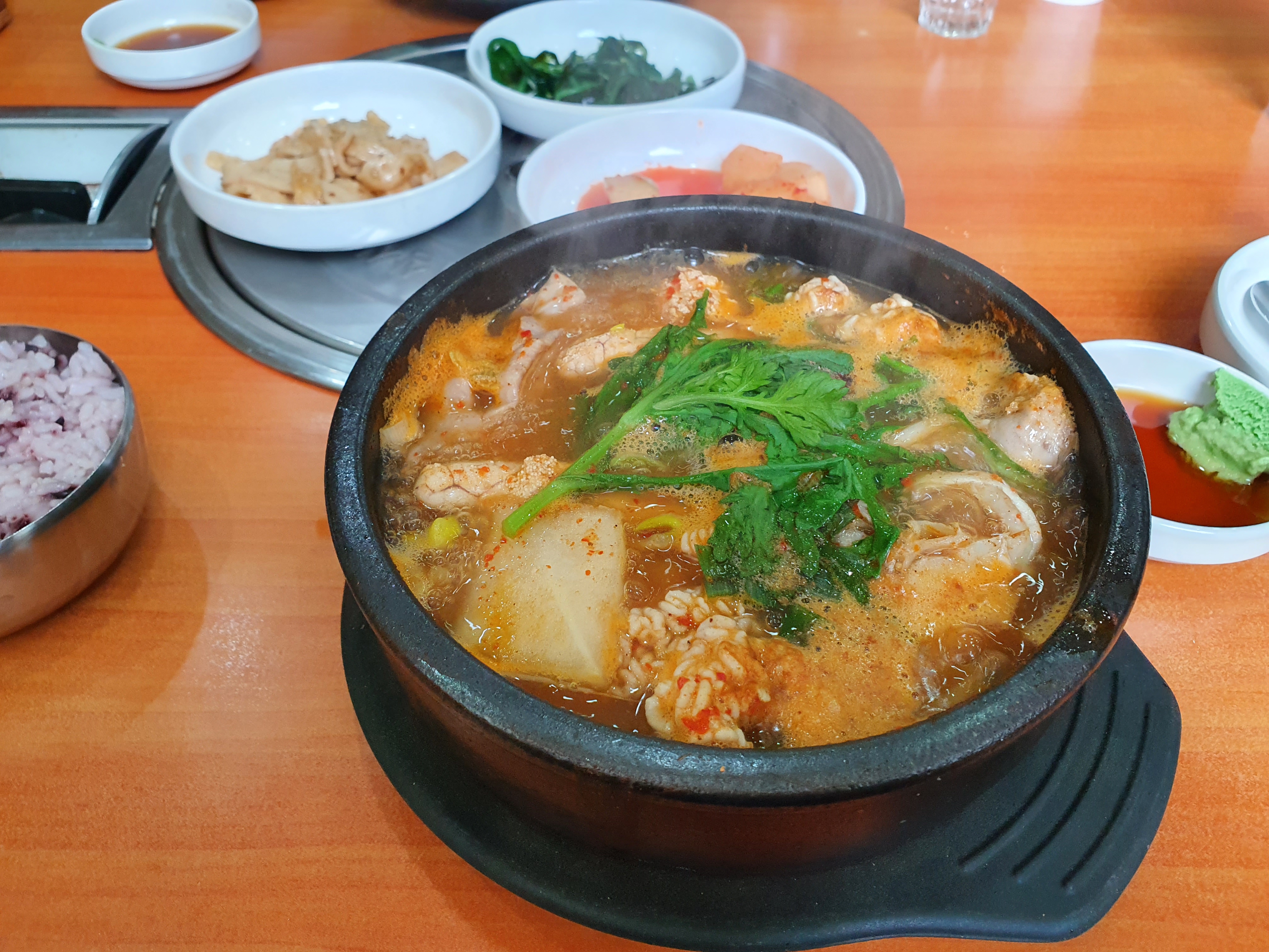 기본 찬에는 별다른 것 없이 3가지가 나왔습니다. 어묵반찬과 깍두기 그리고 시금치 간결하게 해서 나왔습니다. 화려한 찬들을 원하시는 분들에게는 별로 일 수도 있겠다 싶기도 합니다.