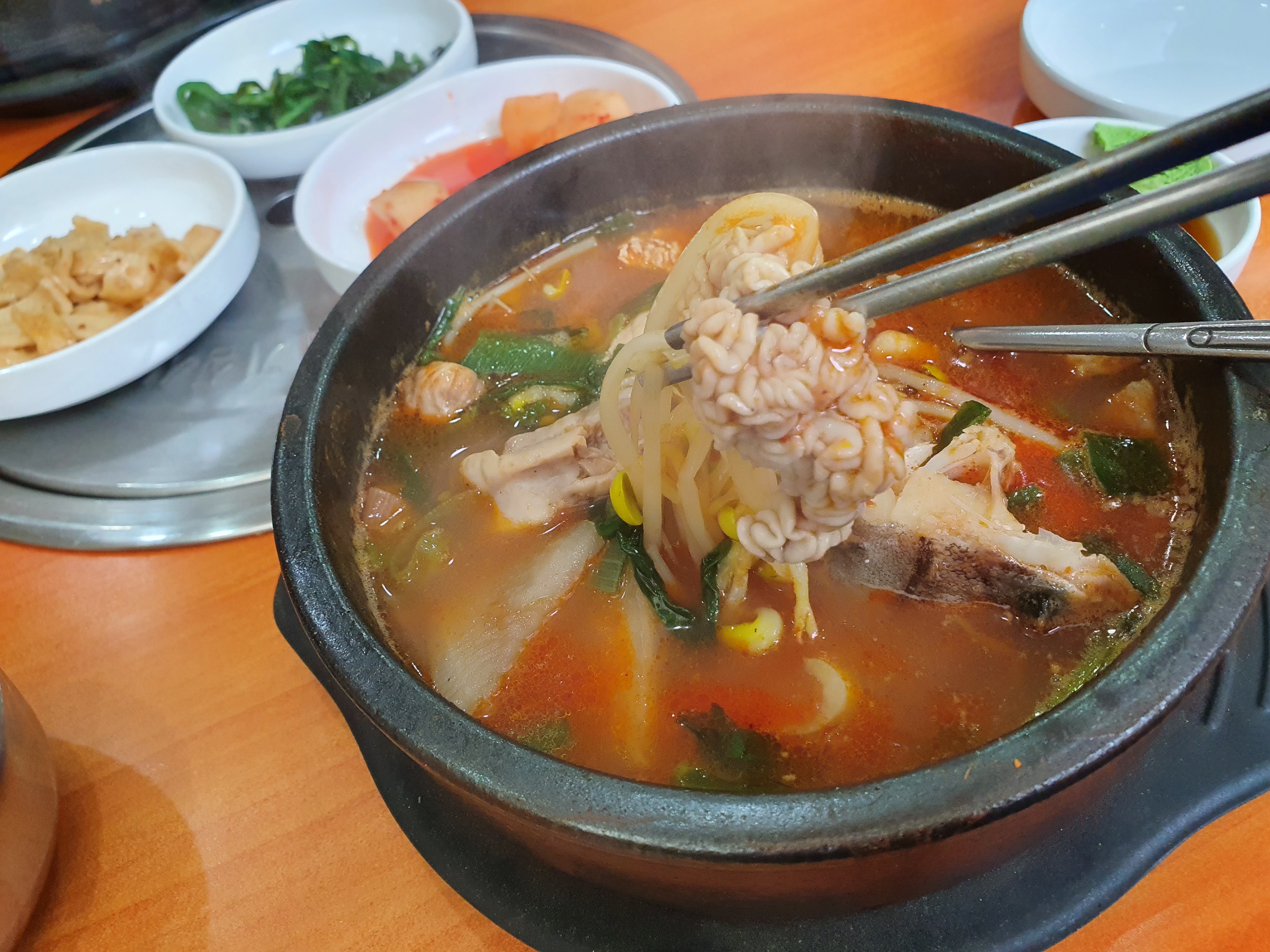 국물 한모금 떠먹어봅니다. 기름기가 확실히 도는 것이 국물이 진하다는 것을 바로 느낄 수 있습니다. 개운하고 깔끔한 맛을 원하시는 분들에게는 아닐 수 있으나 진득하니 걸죽한 것을 원하시는 분들에게는 괜찮은 맛집이라고 할 수 있을 것 같습니다.