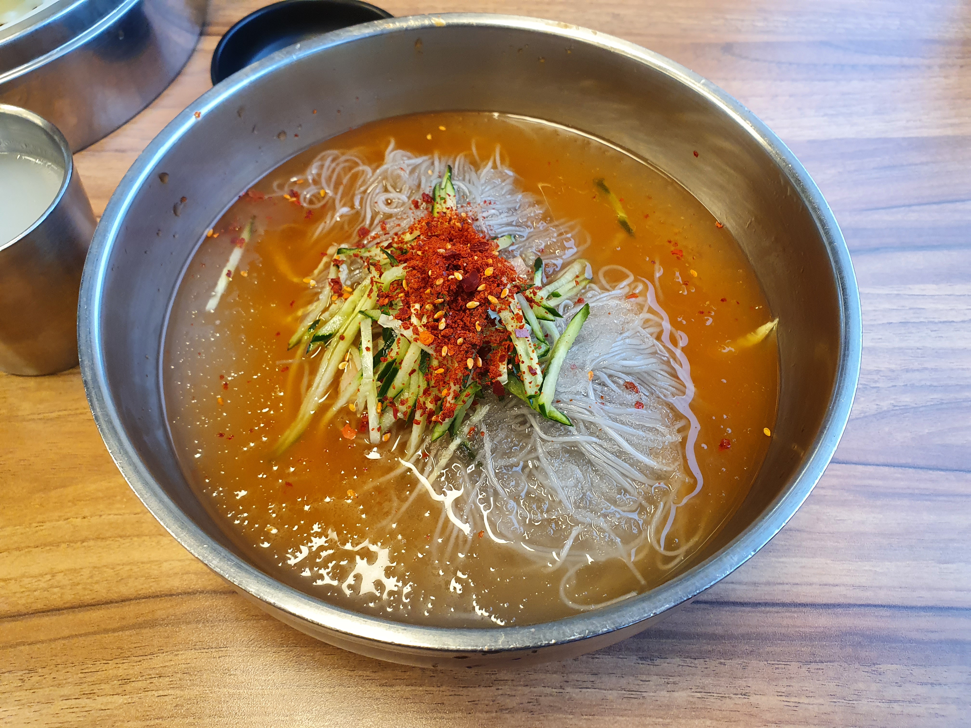 함흥물냉면을 이 집에서 처음 먹어보는데 정말 면발이 질겼다. 조금 심하게 말해서 고무줄인가? 하는 생각이 들기도 했다 이렇게 얇은 면임에도 불구하고 매우 즐겼다. 좋아하시는 분들도 있는데 뭐라고 해야할까 나는 토종닭은 너무 즐겨서 잘 먹는 것을 싫어하는데 토종닭만 좋아하시는 분들이 있는 것 처럼 왠지 이 함흥냉면 면도 그런 것 같은 호불호가 있을 것 같다는 생각이 들었다.