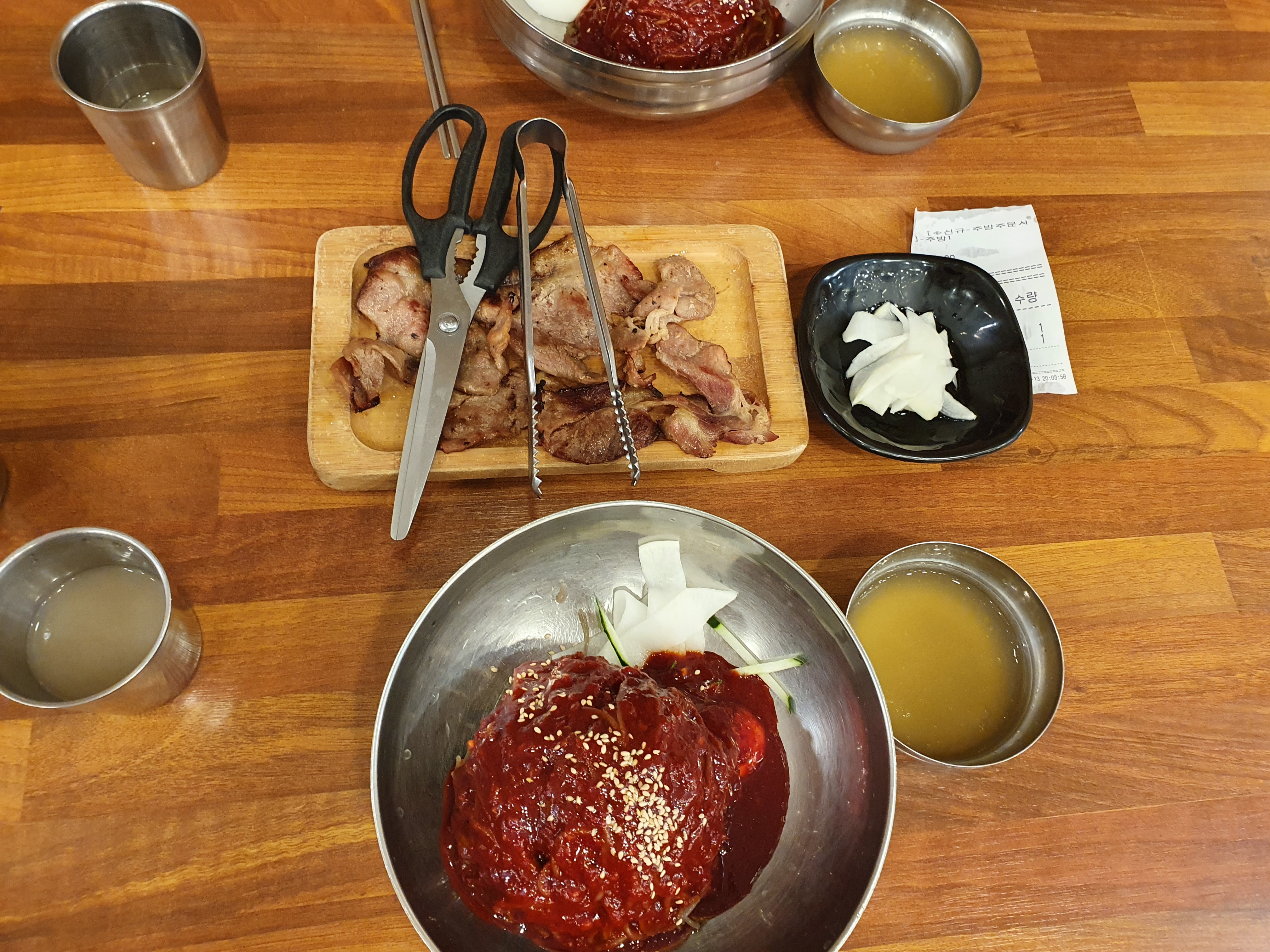 시원하게 비벼서 먹으면 맛있는 것 같아요. 냉면집 답게 숯불고기를 제외하면 그냥 별다른 반찬이나 이런것들은 없습니다. 잘 비벼서 먹기만 하는 느낌이에요. 양념은 무난하게 맛있는 여러분들이 흔하게 비빔냉면 먹었다면 생각하는 그 맛을 잘 따르고 있는 집입니다. 육수도 같이 주는데 양 조절을 잘 해야 합니다. 다 넣으면 싱거울 수도 있어요.