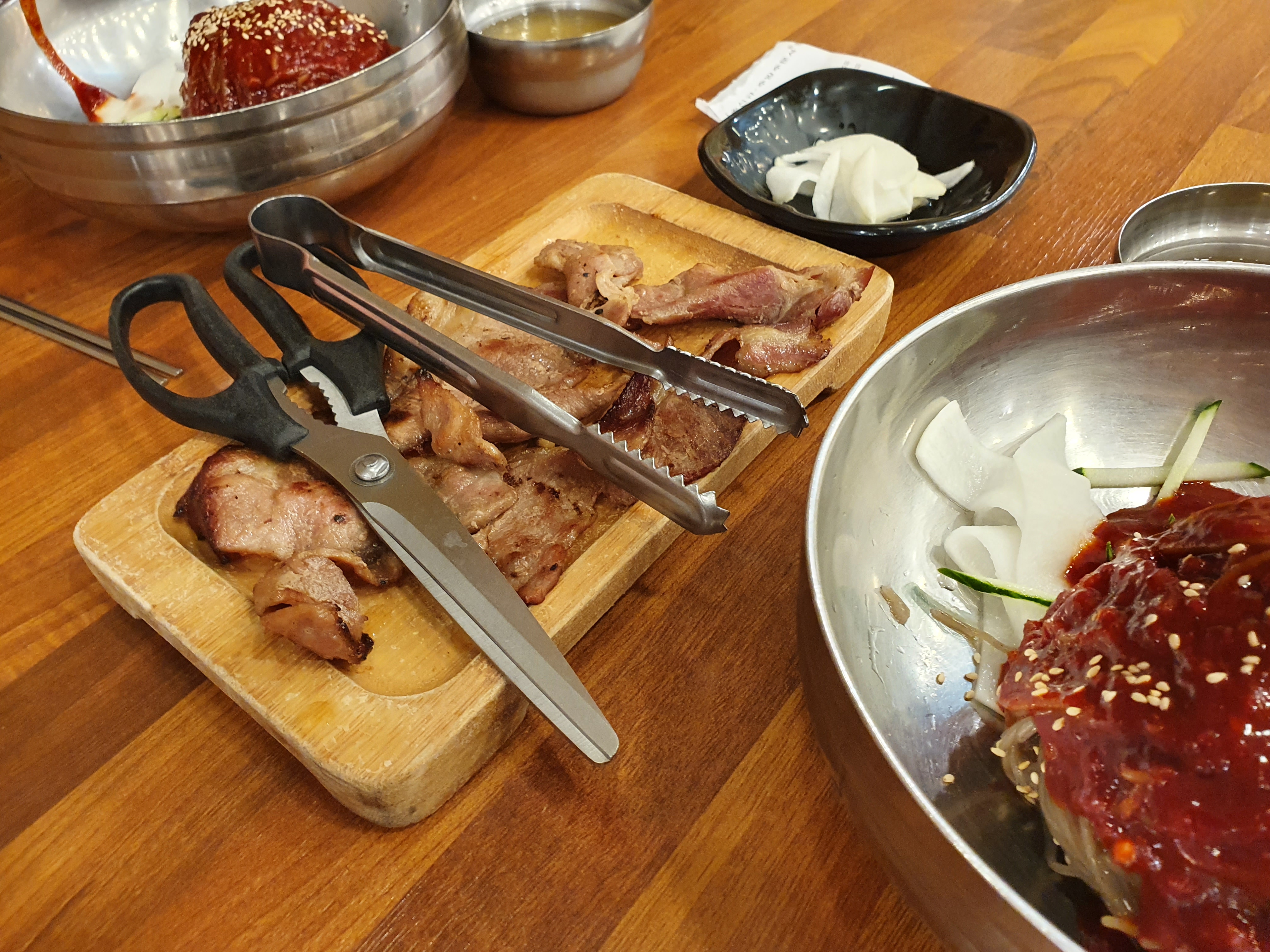 그리고 얇은 숯불고기가 함께 나옵니다. 종이처럼 얇지만 잘 구워져서 나오는 편이라서 입맛을 돋구는데는 딱 괜찮은 수준이라고 생각을 해요. 고기에 냉면은 뭐 맛이 없을 수가 없는 조합이잖아요. 물론 두개를 시켜서 저정도의 양이고 하나를 시키면 더 줄어듭니다.